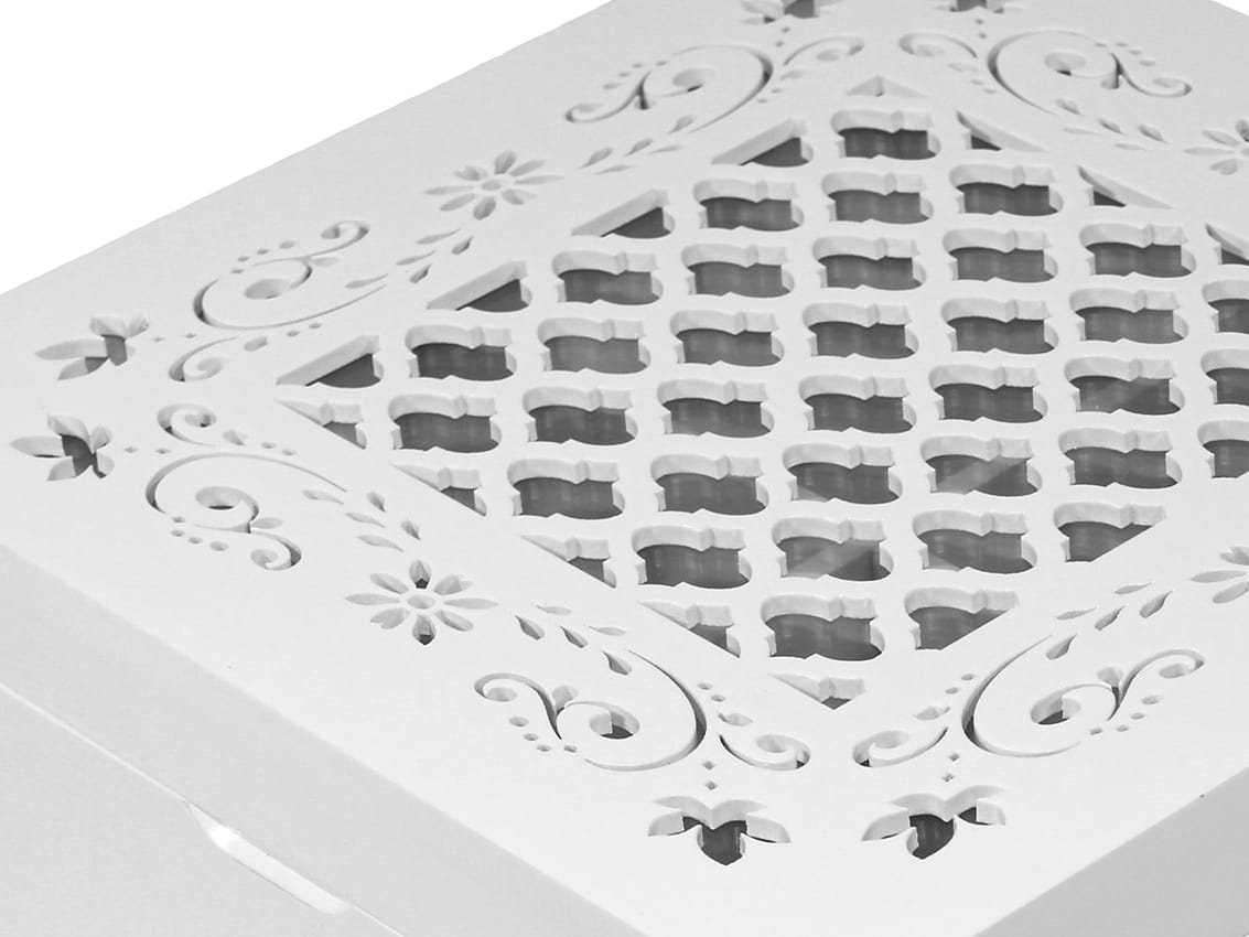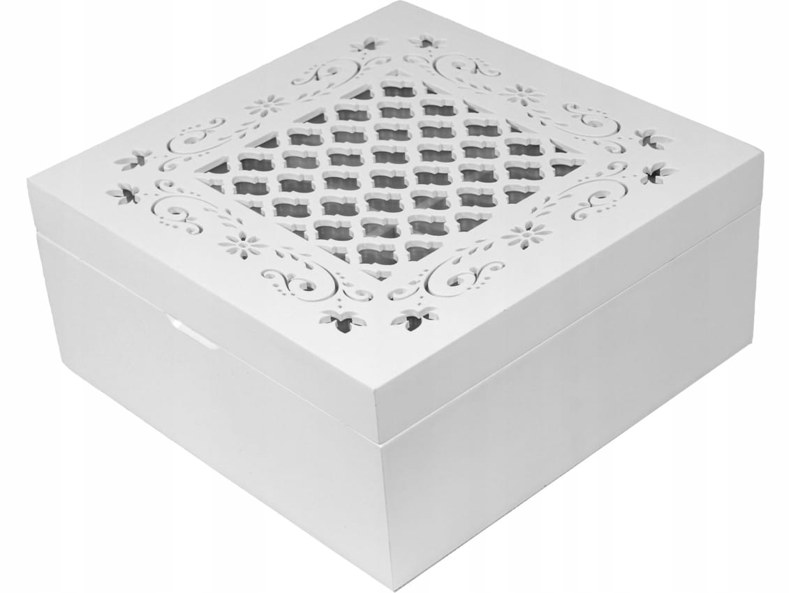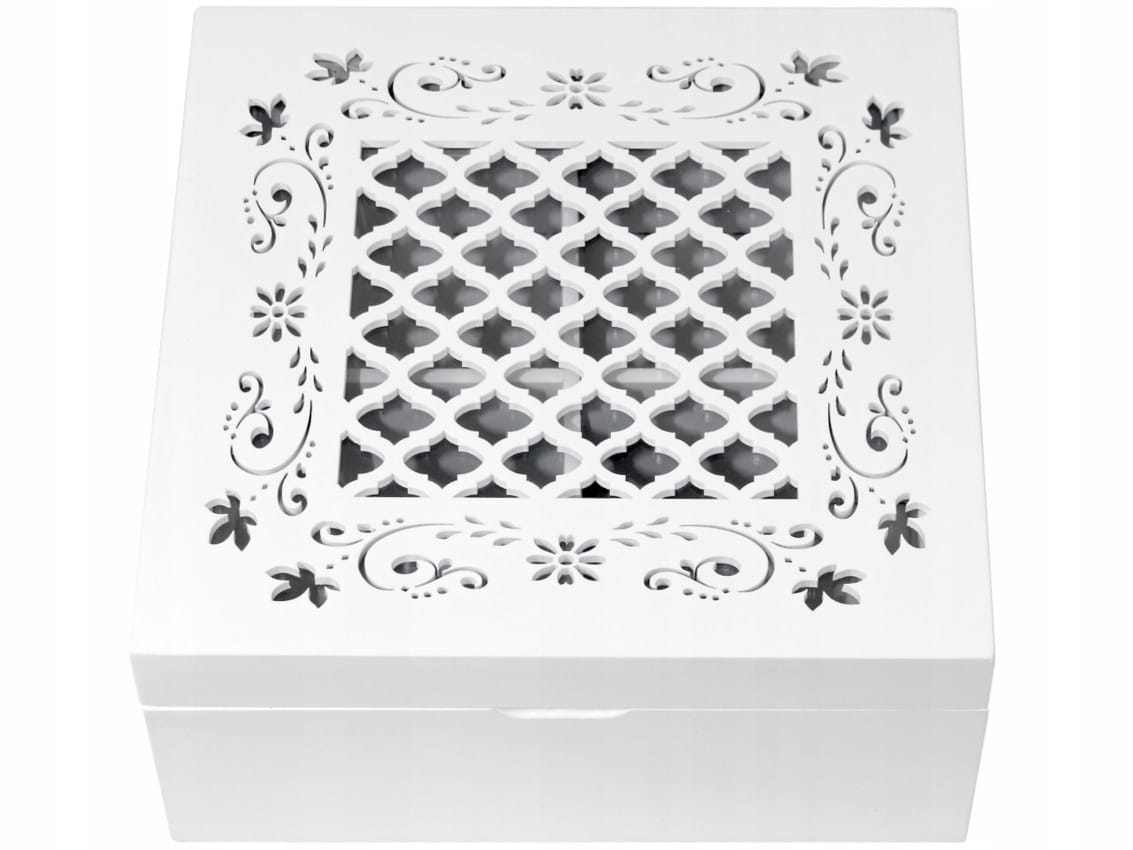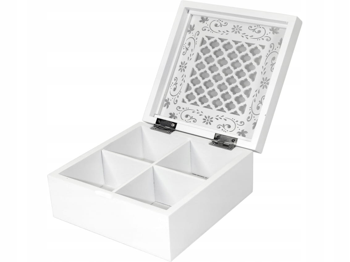 Drewniana skrzyneczka na herbatę. Posiada wewnątrz cztery przegródki. Otwierane, ażurowe wieczko na zawiasach.