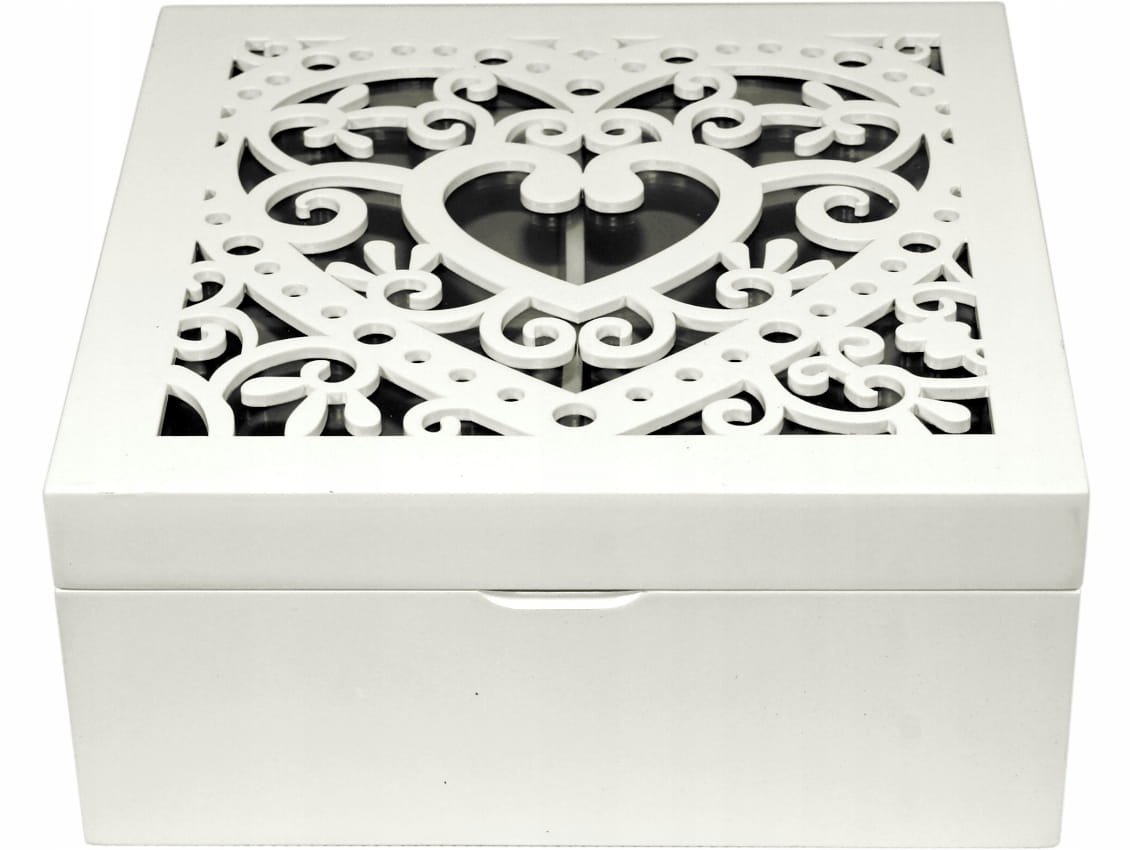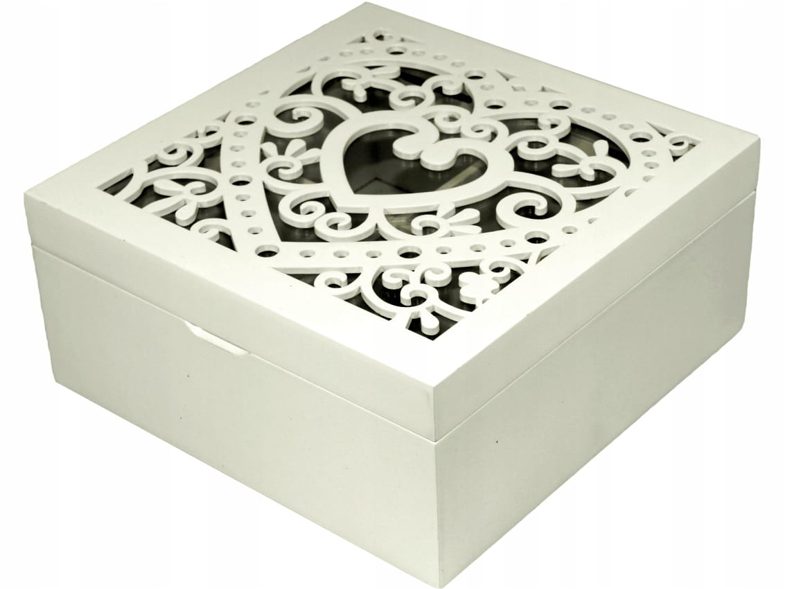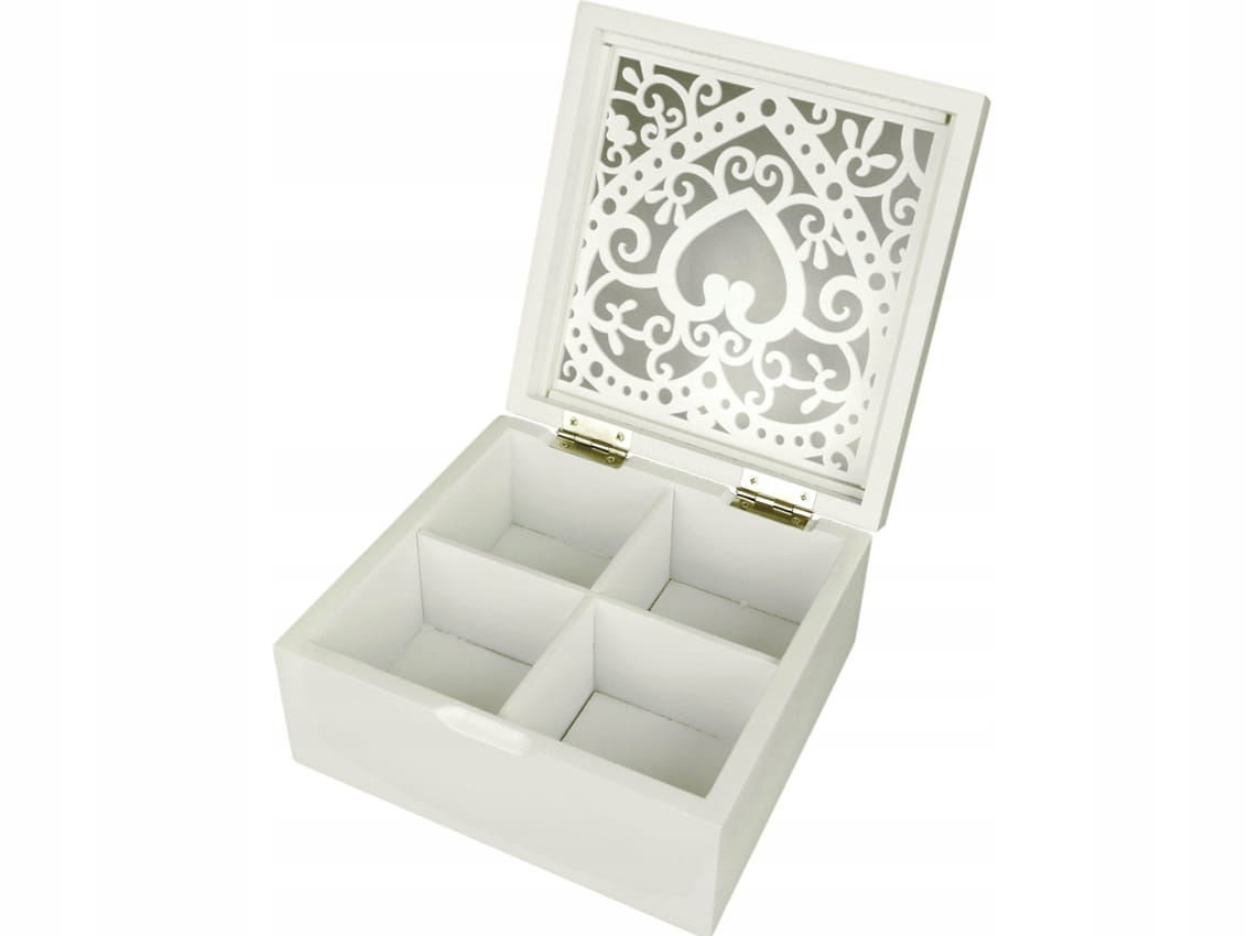 Drewniana skrzyneczka na herbatę. Posiada wewnątrz cztery przegródki. Otwierane, ażurowe, przeszklone wieczko na zawiasach.