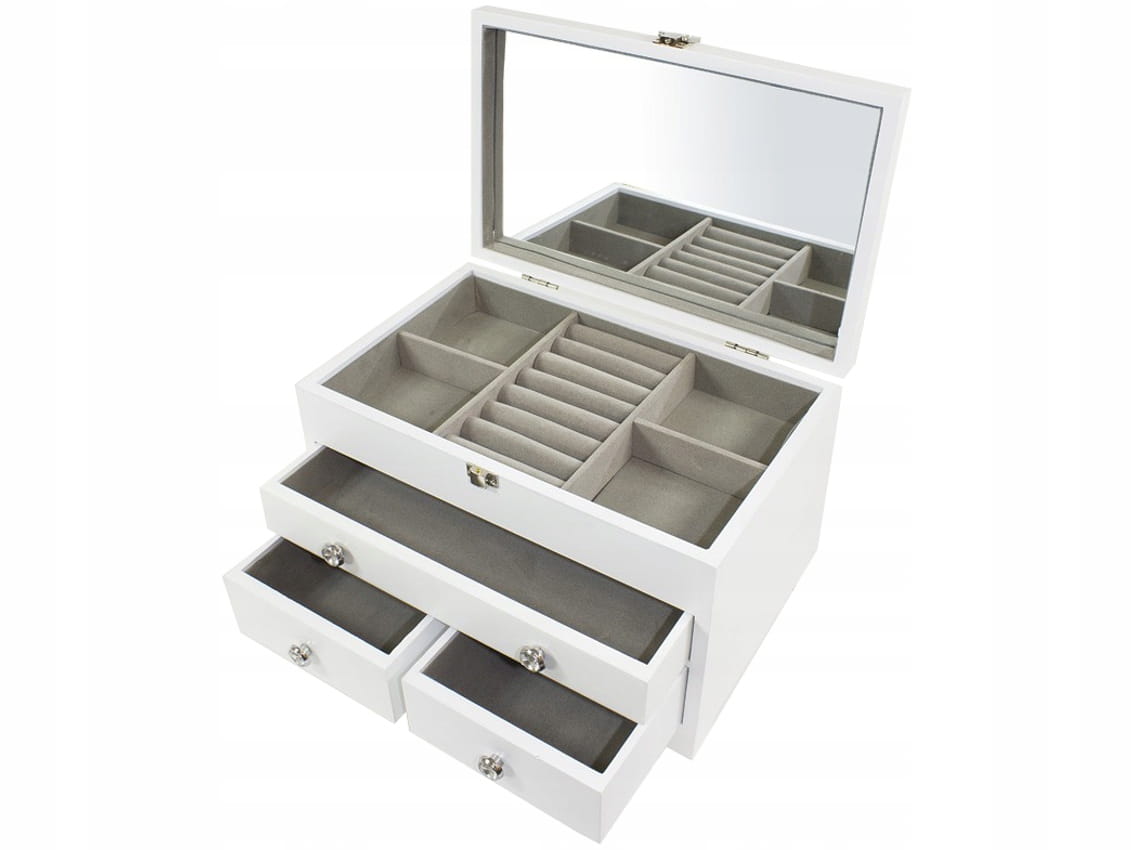 - Górna część podzielona jest na pięć przegródek, w tym miejsce na pierścionki i kolczyki