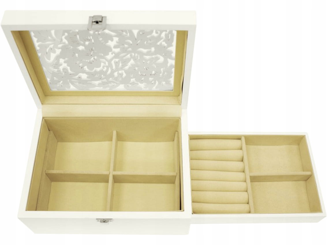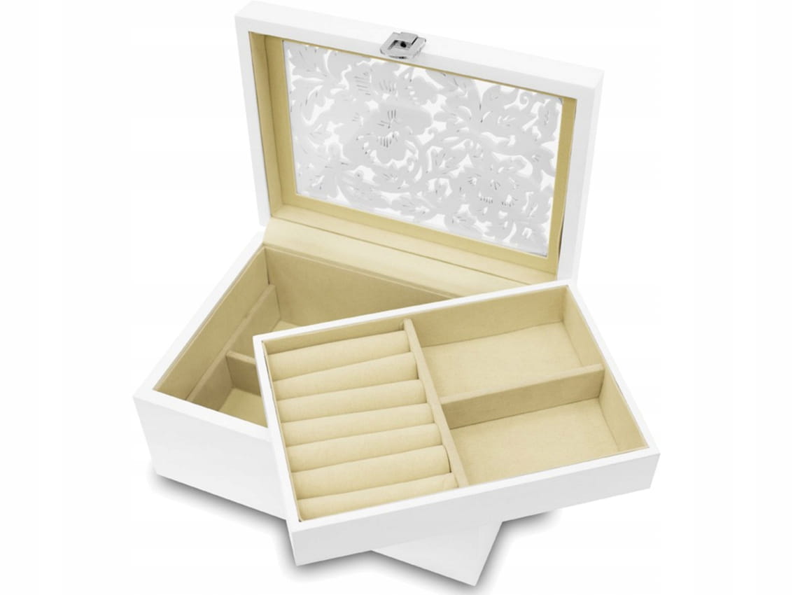 - Górna część podzielona jest na trzy przegródki, w tym miejsce na pierścionki i kolczyki