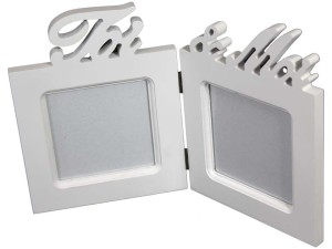 Stylowa ramka na zdjęcia wykonana z drewna, w kolorze białym, łączona na środku zawiasem.