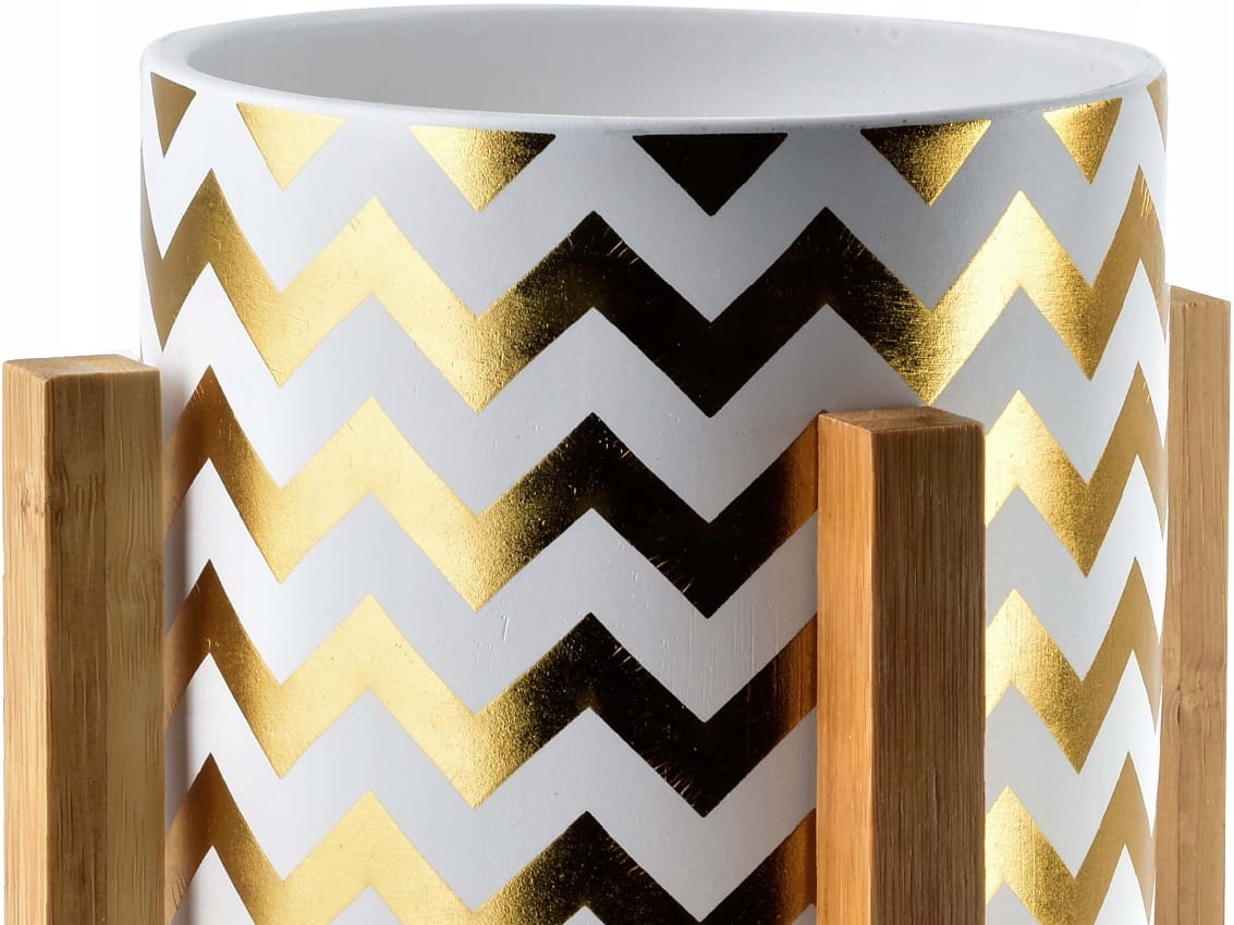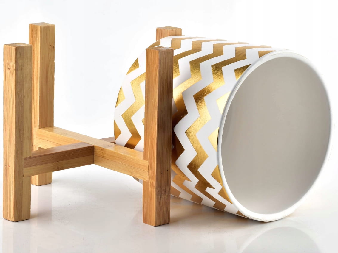 Kolekcja AVA - ceramiczna osłonka/doniczka, umieszczona na drewnianym stojaku.