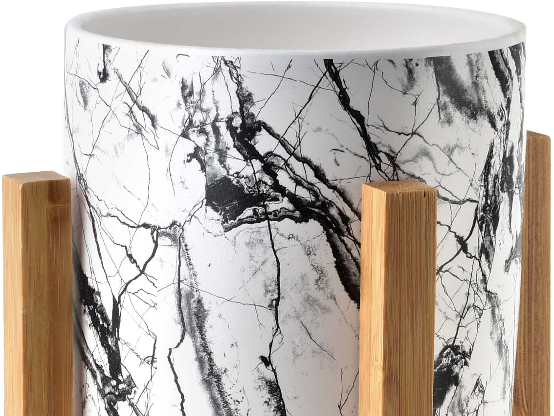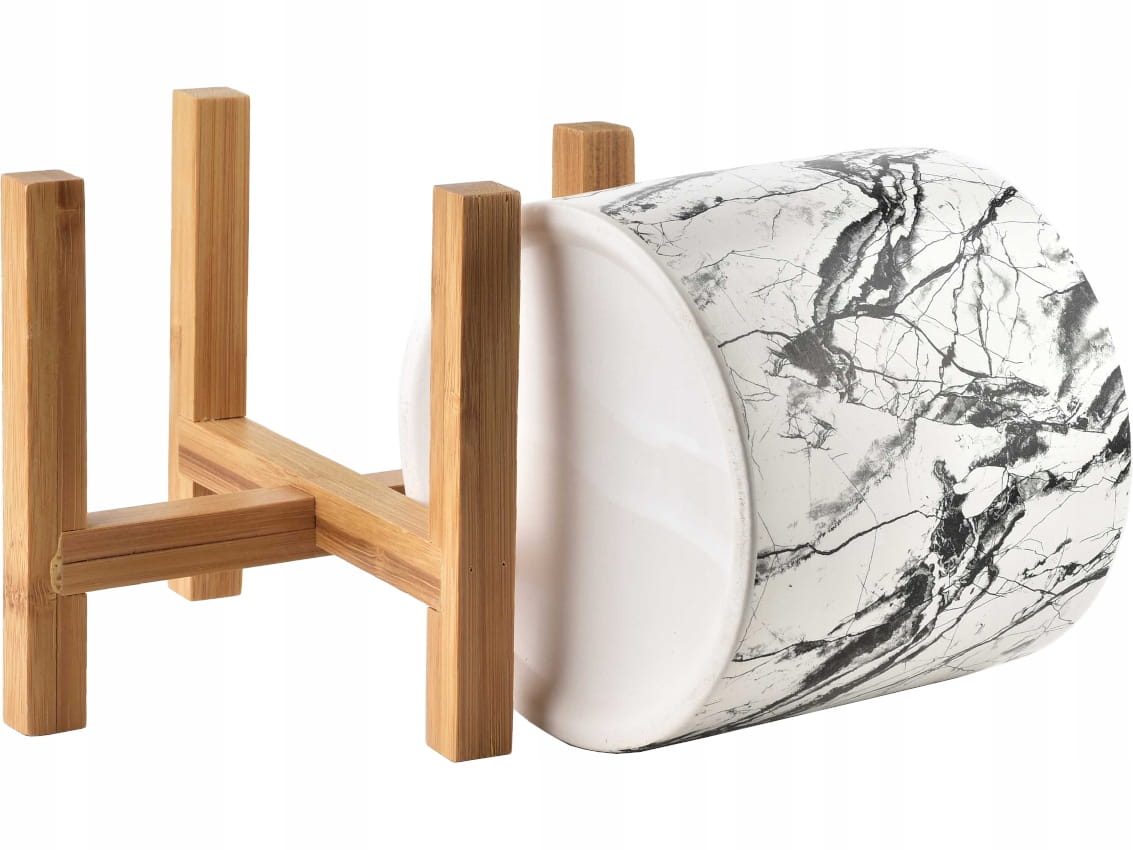 Kolekcja AVA - ceramiczna osłonka/doniczka, umieszczona na drewnianym stojaku.