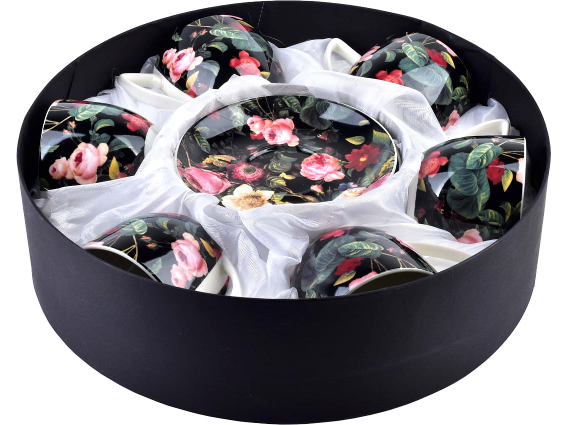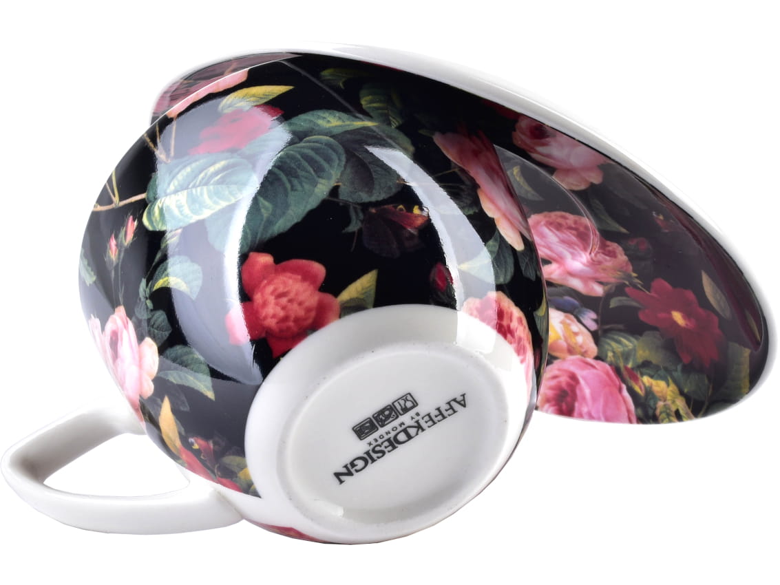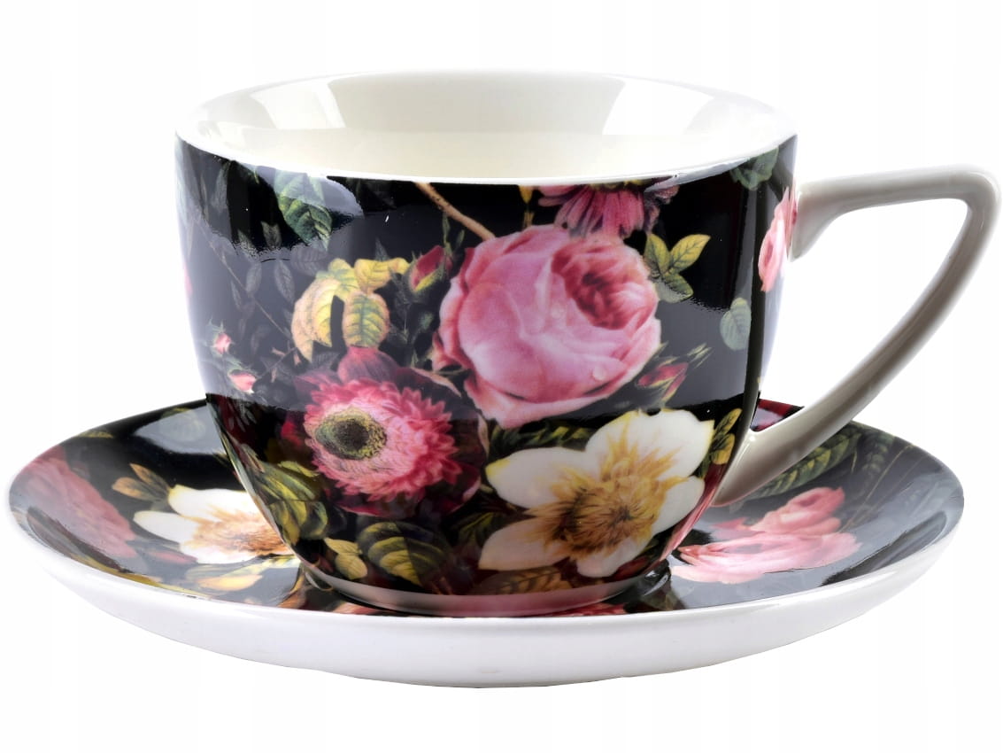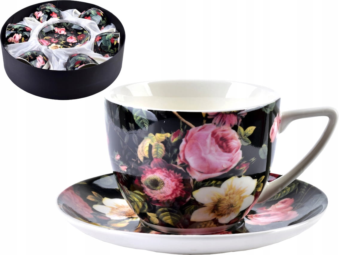 Zestaw wykonany jest z wysokiej jakości białej porcelany, z motywem kolorowych kwiatów na czarnym tle. Modny kwiatowy wzór sprawia, że filiżanki pasują do każdego wystroju wnętrza.