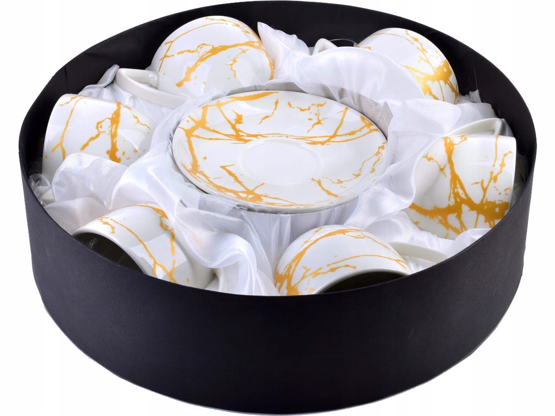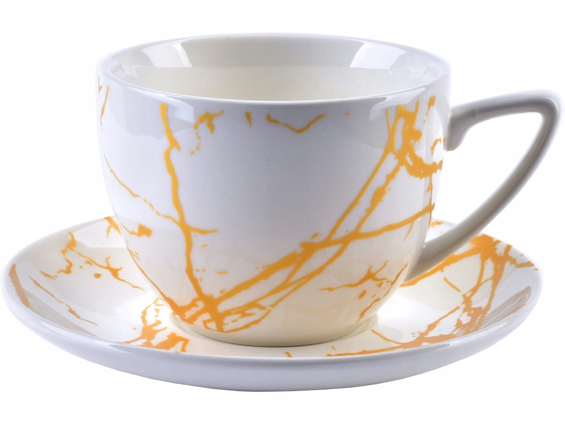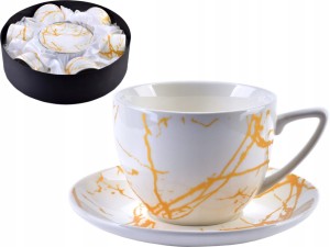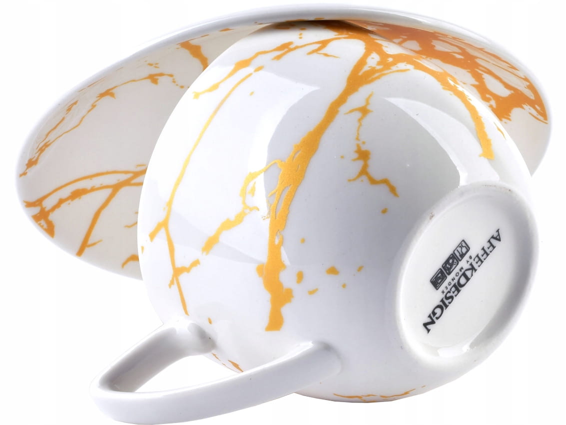 Zestaw wykonany jest z wysokiej jakości białej porcelany, ze złotymi zdobieniami na białym tle. Modny wzór marmuru sprawia, że filiżanki pasują do każdego wystroju wnętrza.