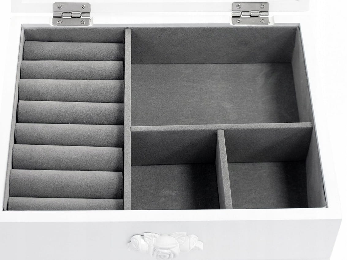 - Górna część podzielona jest na cztery przegródki, w tym miejsce na pierścionki i kolczyki