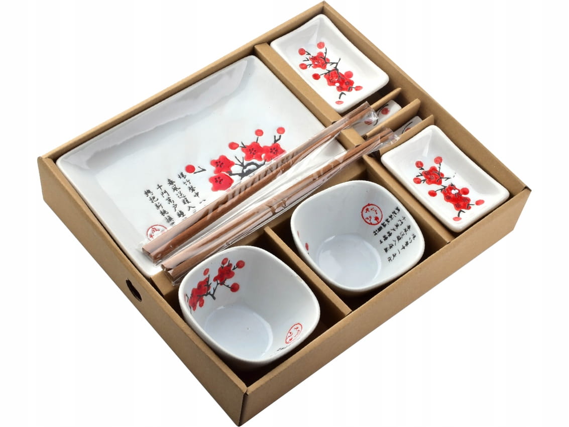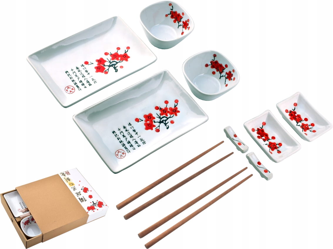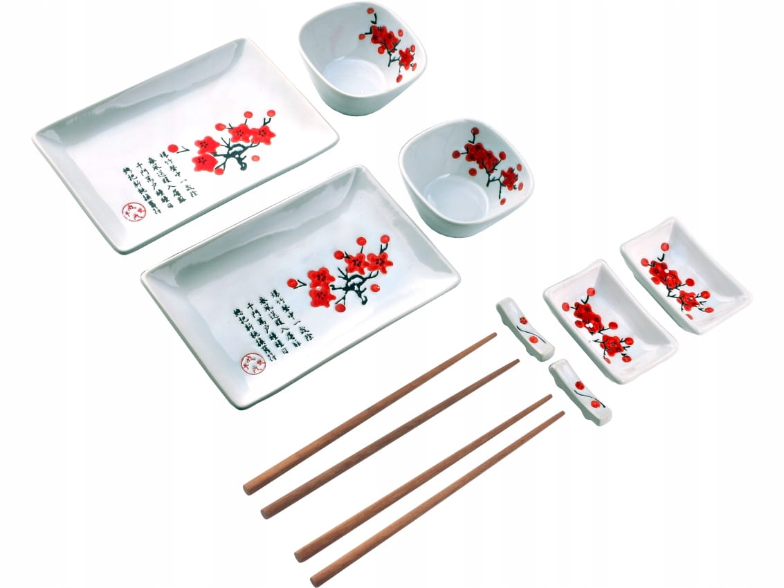 Piękny, klasyczny, porcelanowy zestaw do sushi dla 2 osób - składający się z 10 elementów.