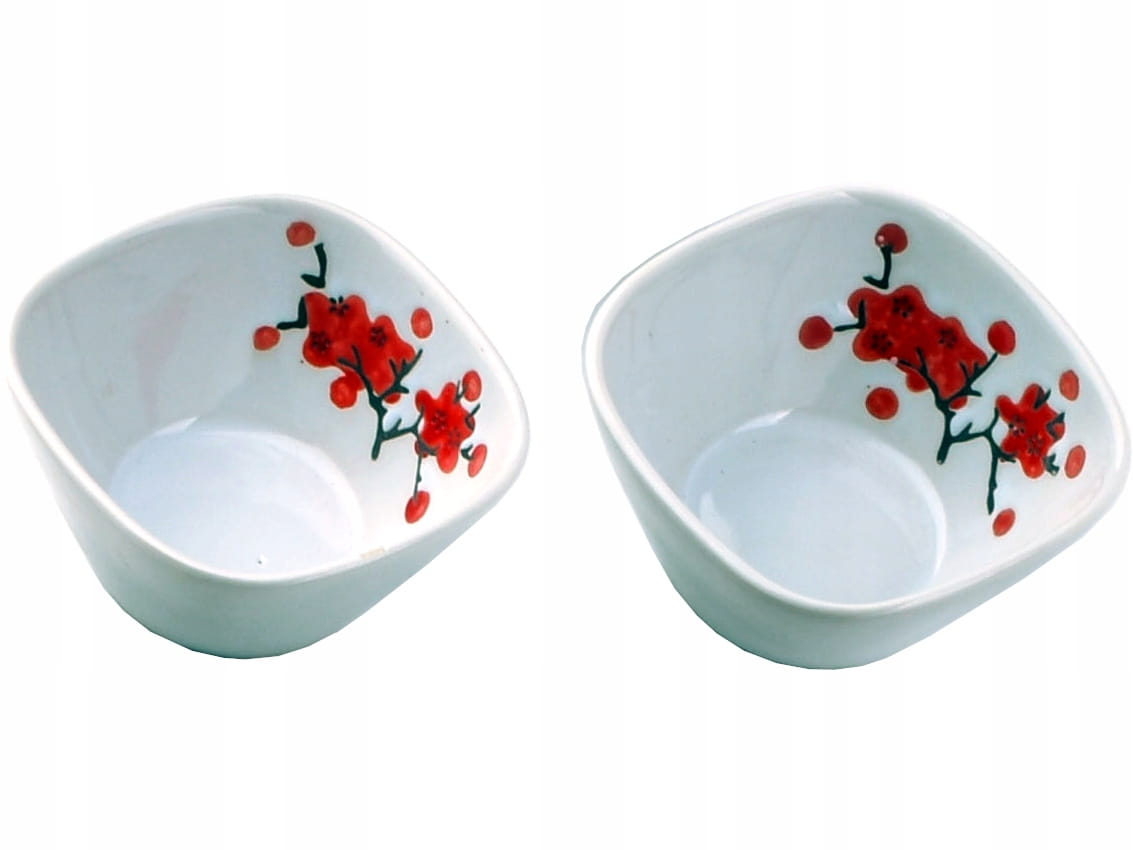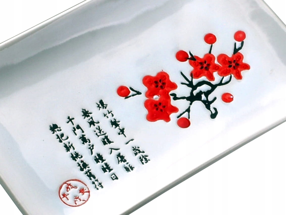 Naczynia do sushi są zdobione czerwonymi kwiatami i czarnymi japońskimi napisami na białym tle.