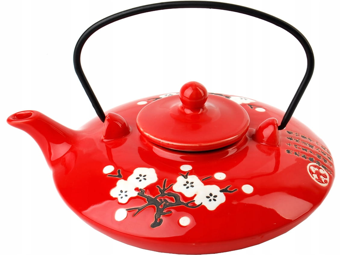 Czajnik wykonany z wysokiej jakości ceramiki, zdobionej pięknymi biało-czarnymi kwiatami i czarnymi japońskimi napisami na czerwonym tle.
