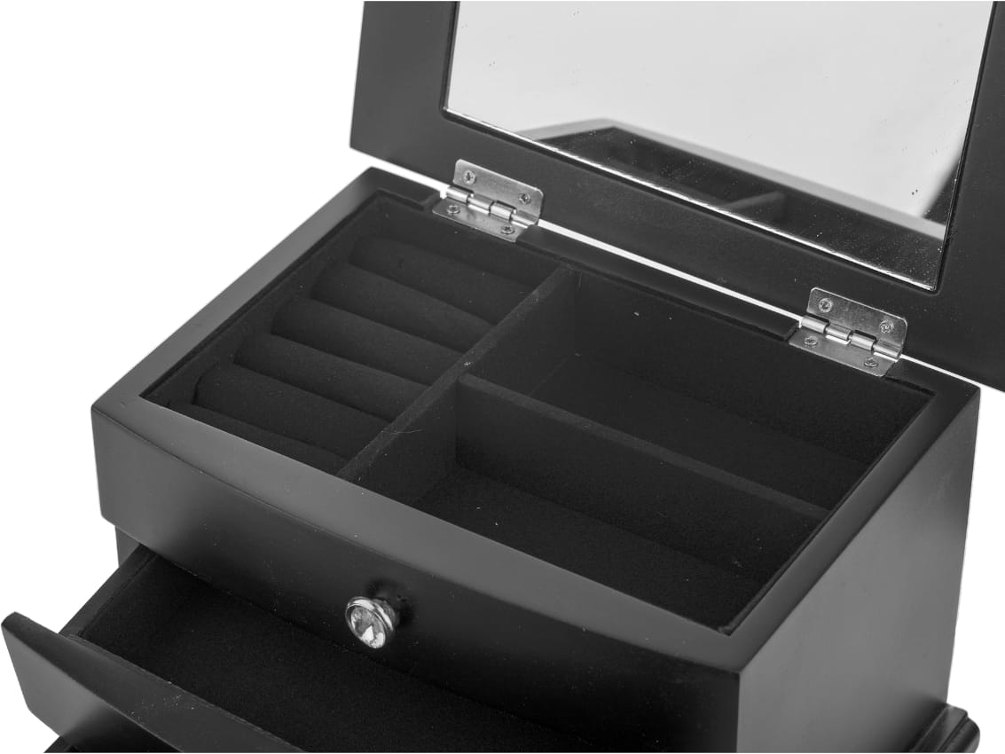 - Górna część podzielona jest na trzy przegródki, w tym miejsce na pierścionki i kolczyki