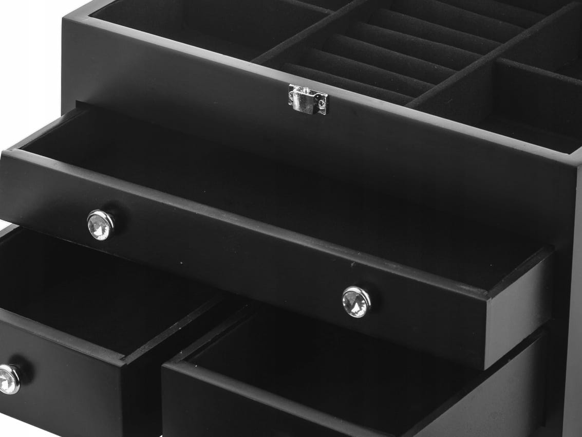 - Górna część podzielona jest na pięć przegródek, w tym miejsce na pierścionki i kolczyki