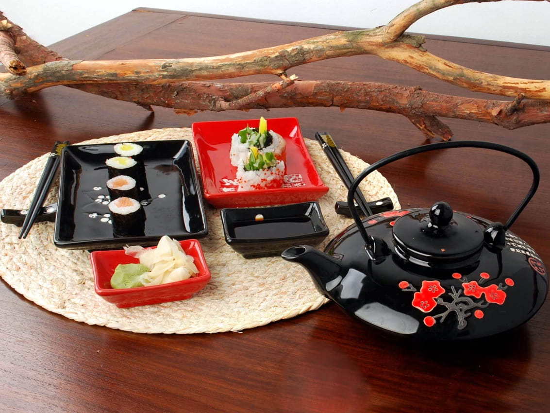 - Wykonany z wysokiej jakości ceramiki, zdobionej pięknymi czerwonymi kwiatami i białymi japońskimi napisami na czarnym tle.