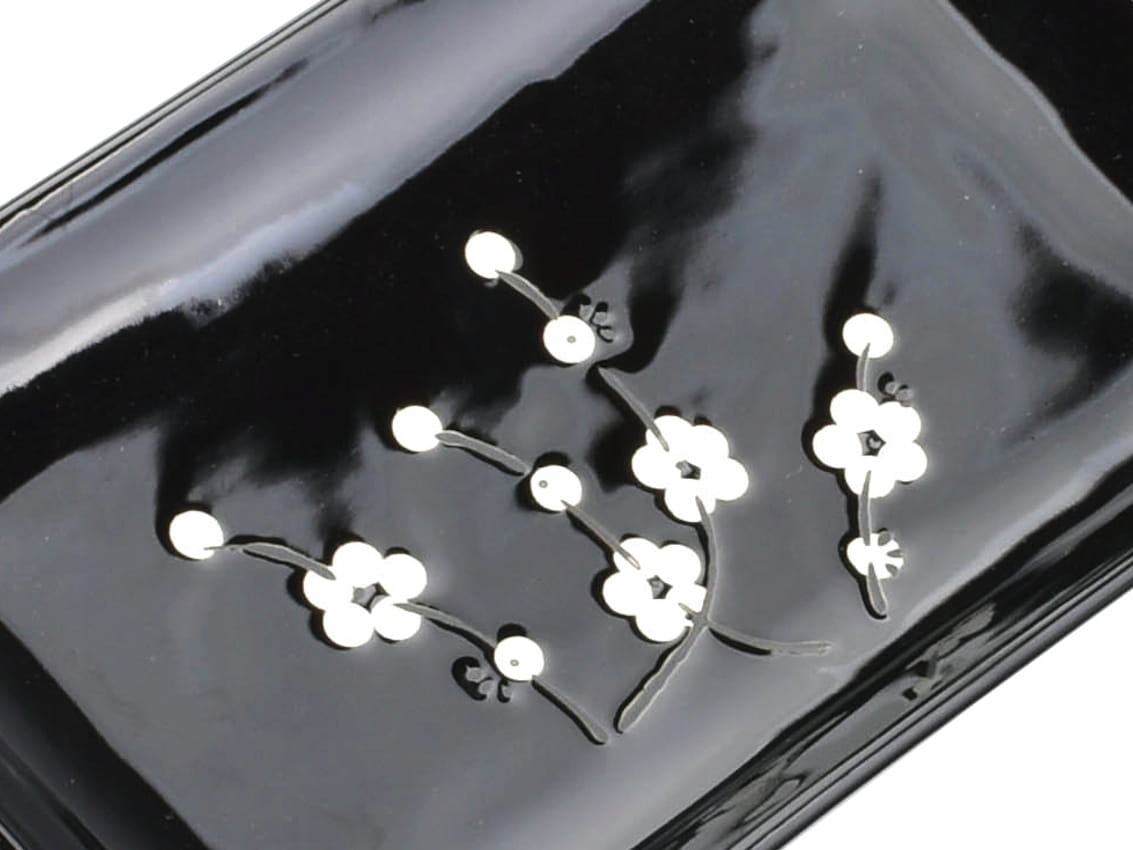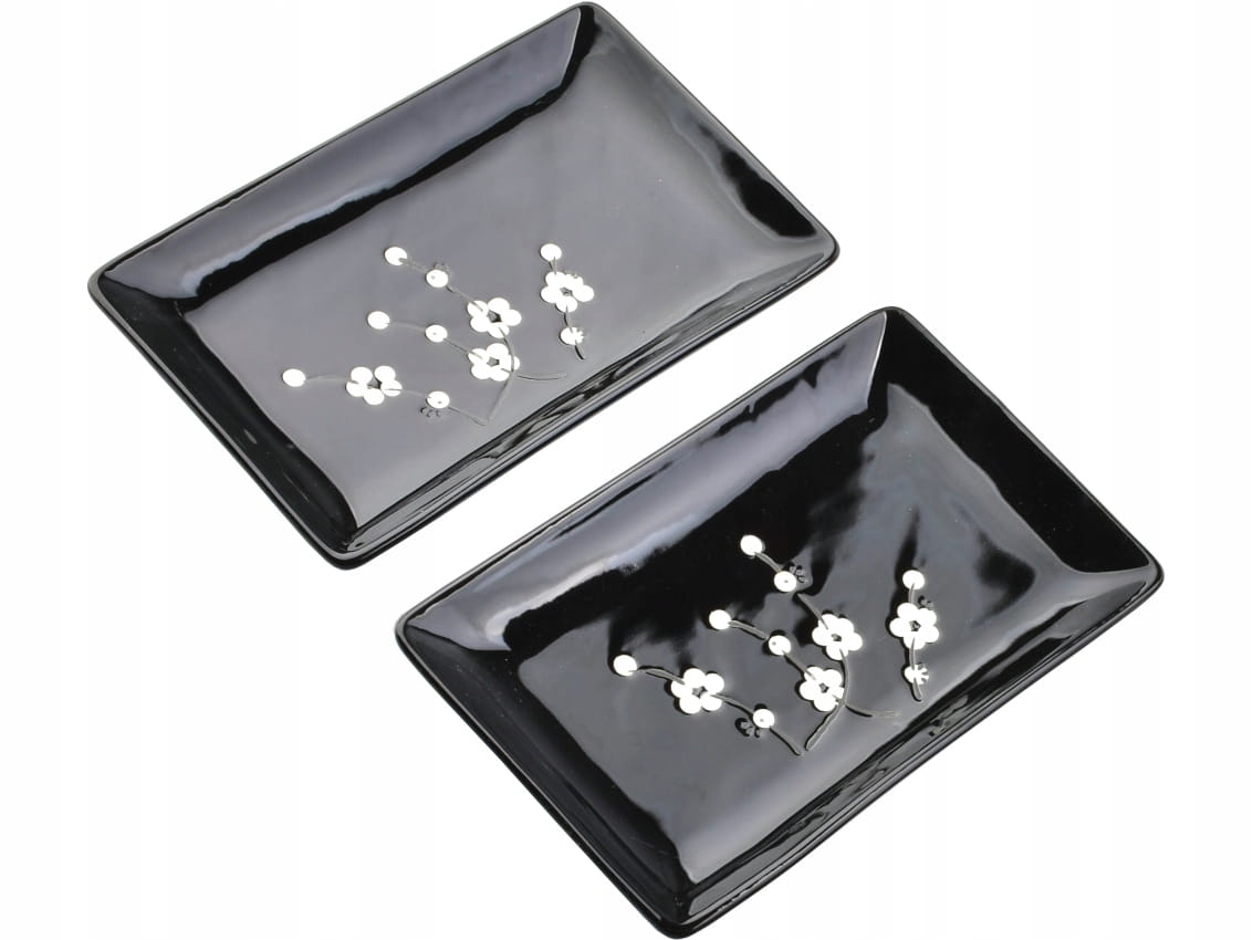 Naczynia do sushi są zdobione białymi kwiatami na czarnym tle.