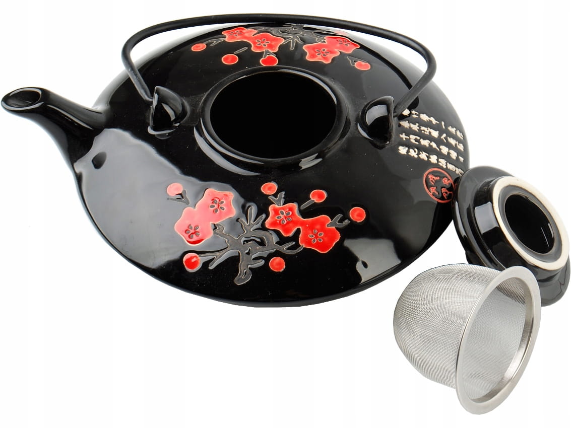 Czajnik wykonany z wysokiej jakości ceramiki, zdobionej pięknymi czerwonymi kwiatami i białymi japońskimi napisami na czarnym tle.