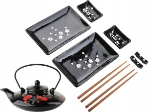 Piękny, klasyczny, porcelanowy zestaw do sushi dla 2 osób, składający się z 8 elementów + ceramiczny, płaski czajnik z rączką, w stylu japońskim.