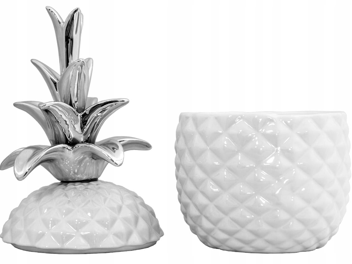 Figurka / pojemnik ANANAS - wykonany ze szlachetnej ceramiki w kolorze białym, ze srebrnymi liśćmi. Pojemnik składa się korpusu oraz pokrywki.