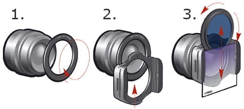- w jednym uchwycie możemy zamocować na raz trzy filtry prostokątne lub jeden filtr okrągły + dwa prostokątne oraz dodatkowo osłonę przeciwsłoneczną i dekielek