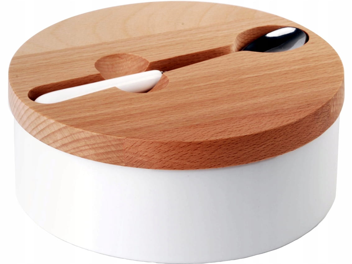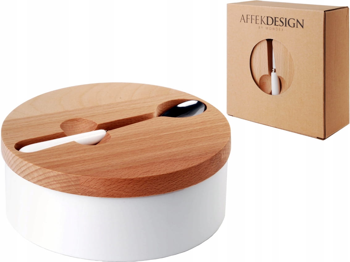 Cukiernica porcelanowa z pokrywą z drewna bambusowego oraz łyżeczką ze stali nierdzewnej.