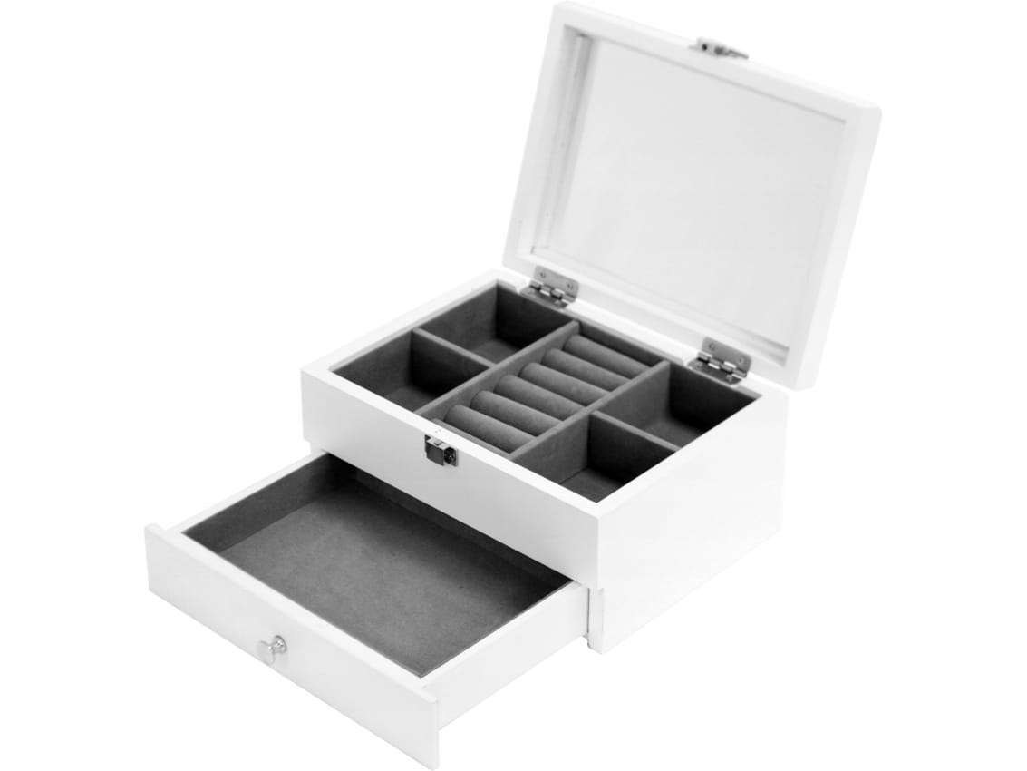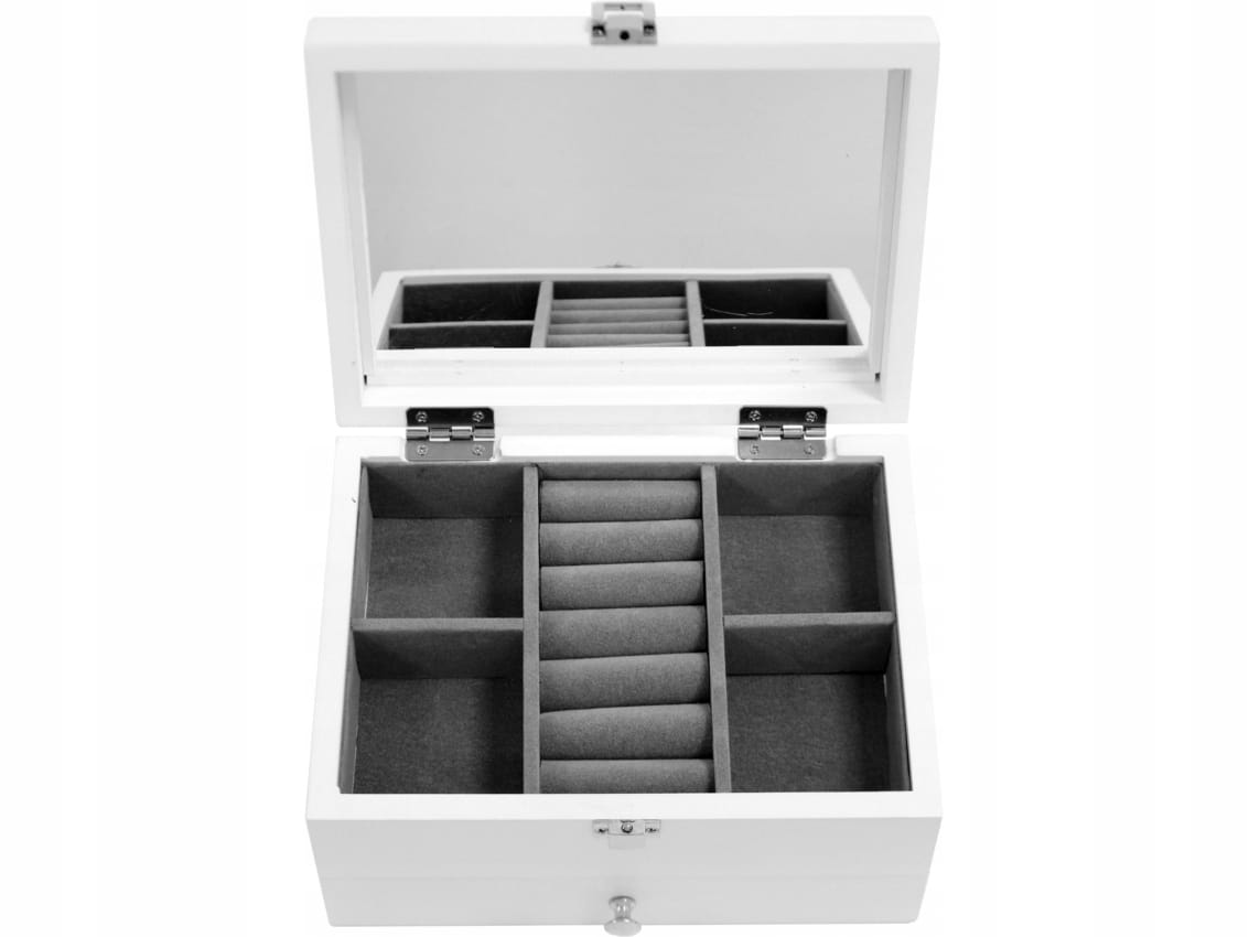 - Górna część podzielona jest na pięć przegródek, w tym miejsce na pierścionki i kolczyki