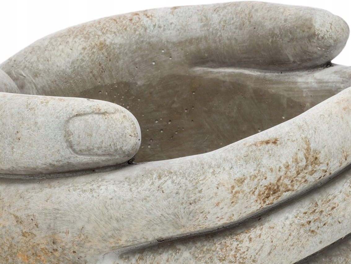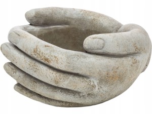 Cementowa doniczka, osłonka w kształcie złączonych dłoni.