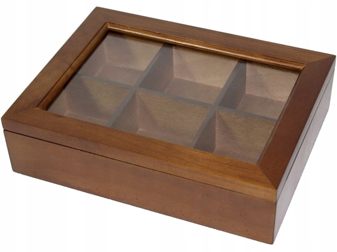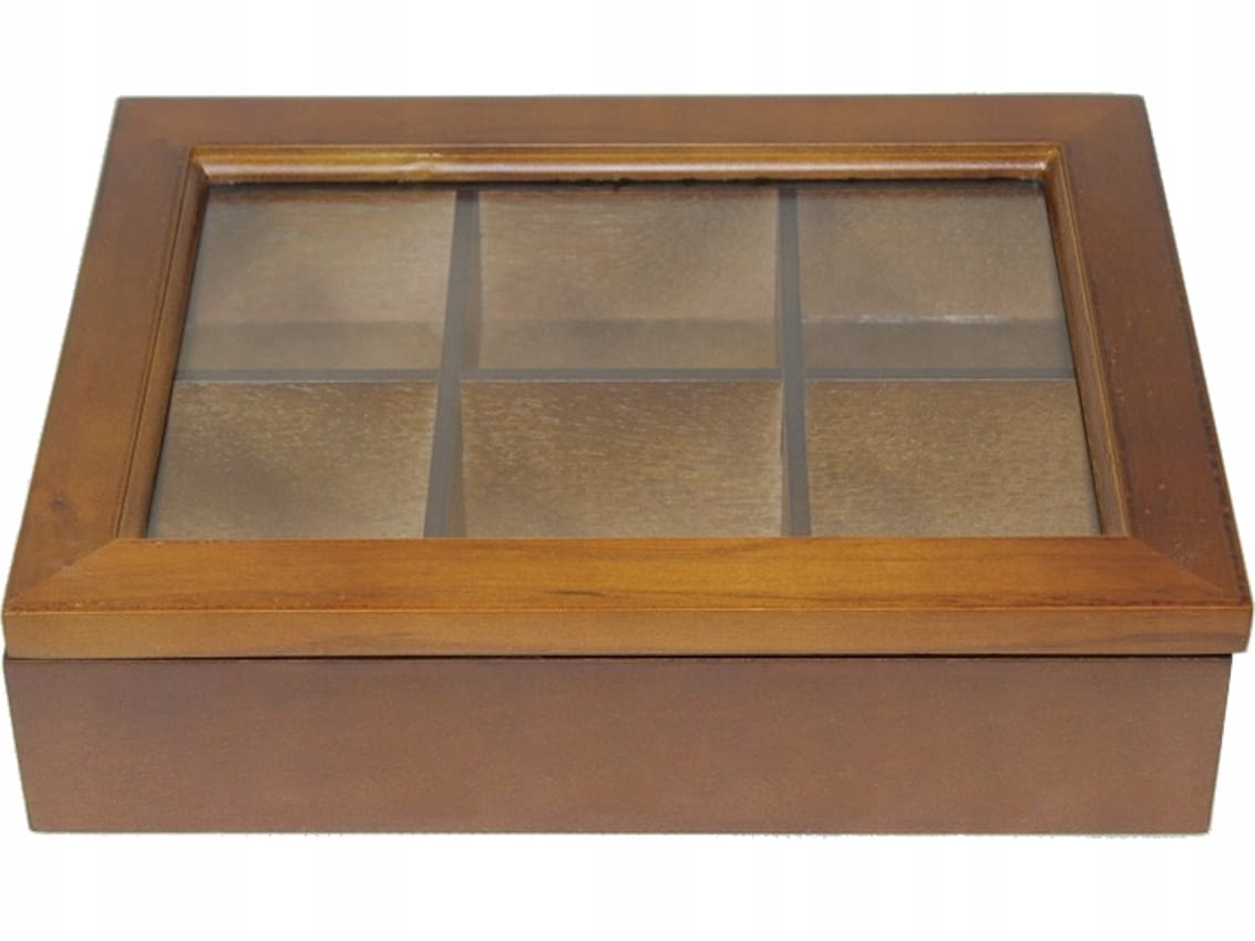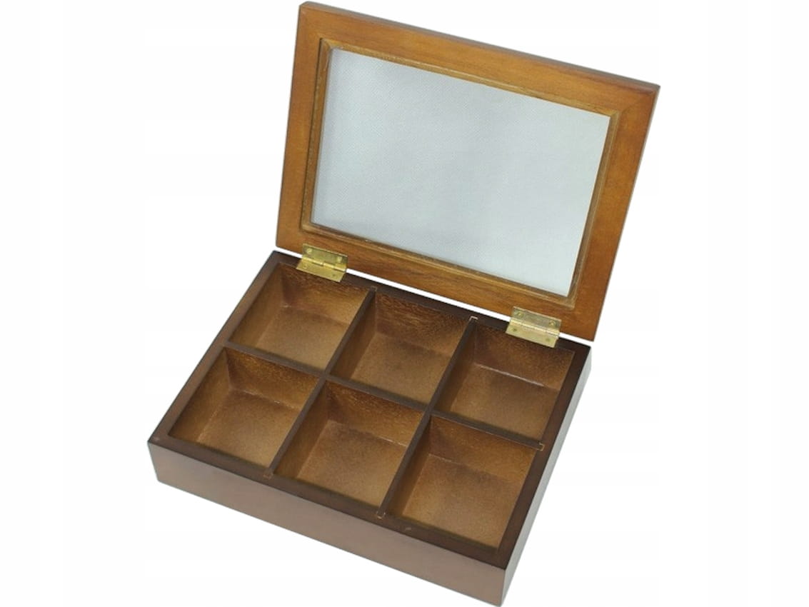 Drewniana skrzyneczka na herbatę. Posiada wewnątrz sześć przegródek. Otwierane, przeszklone wieczko na metalowych zawiasach.