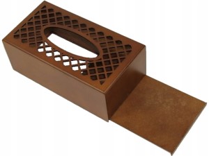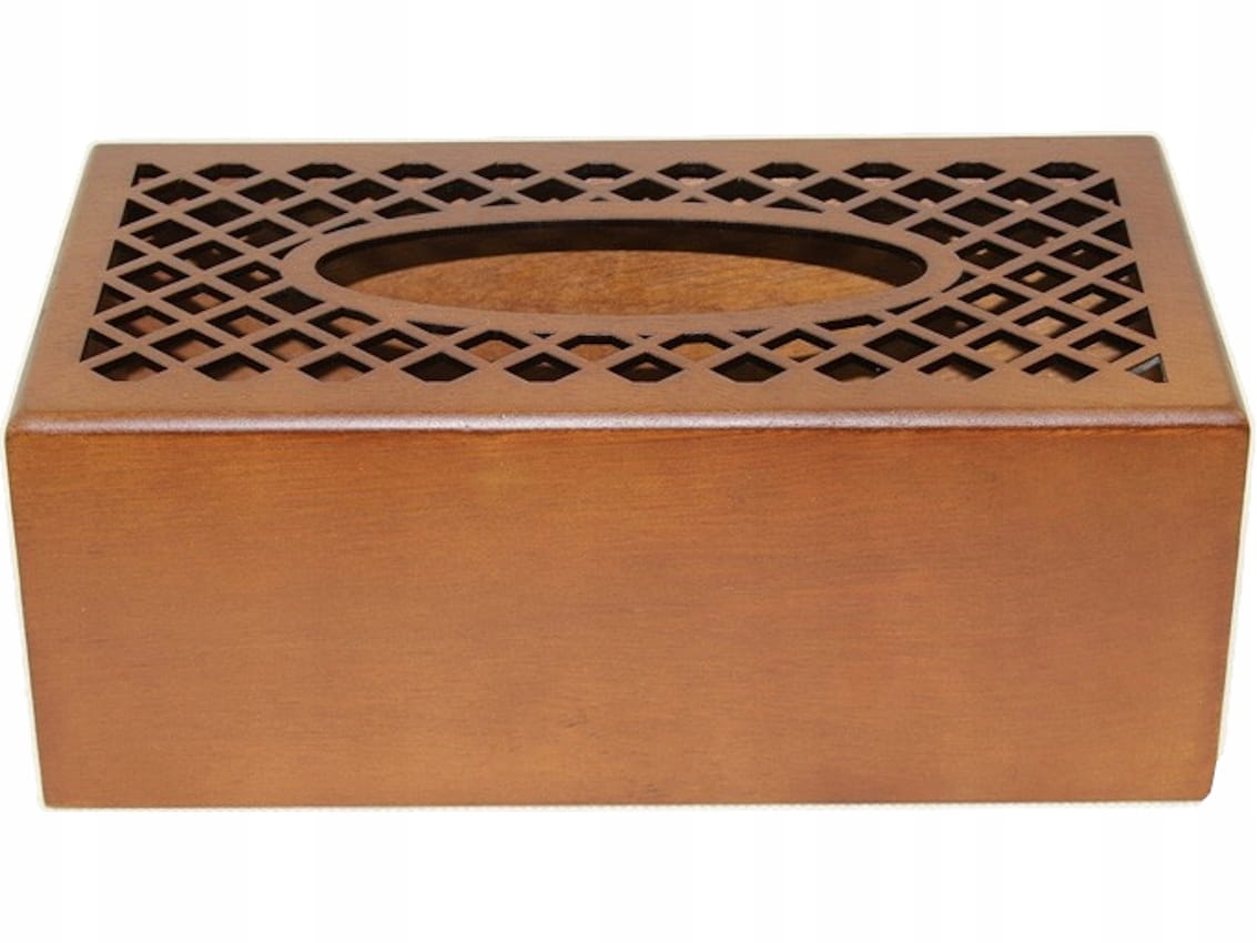 Ażurowe, eleganckie pudełko na chusteczki, wykonane z drewna pomalowanego na brązowy kolor.
