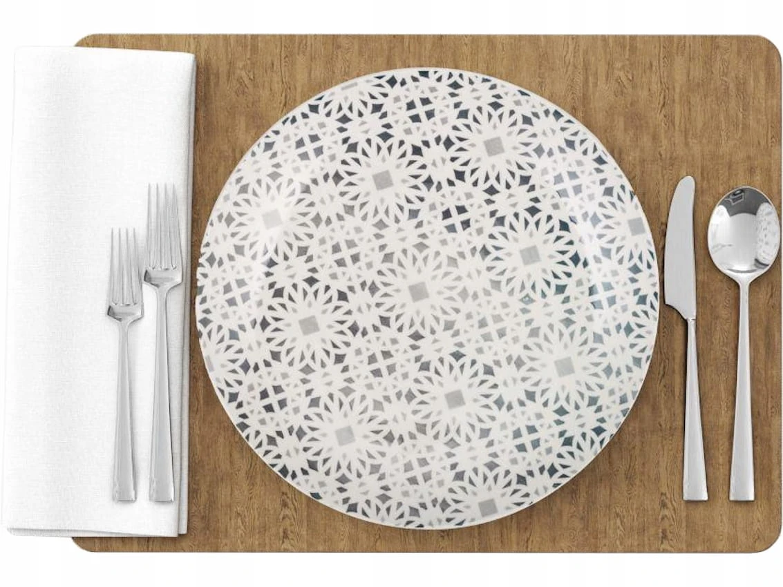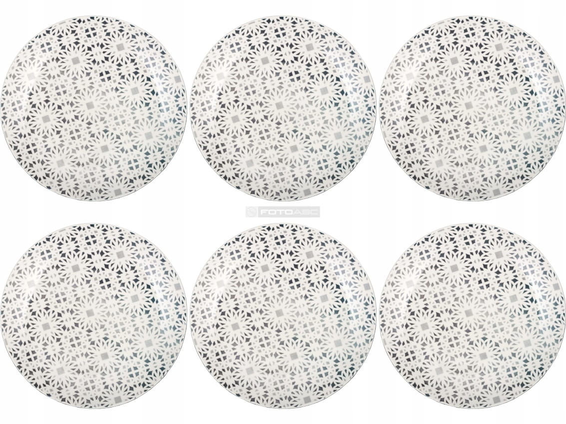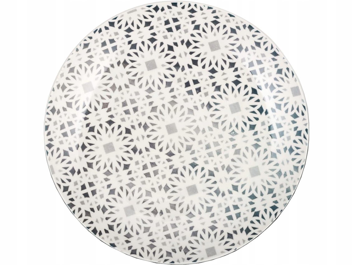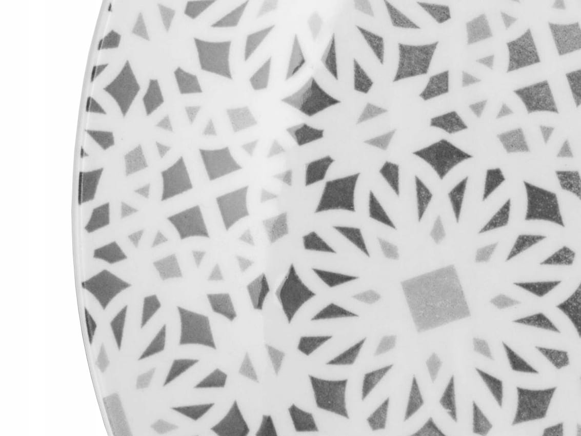 Przepiękne, białe, porcelanowe talerze obiadowe z oryginalnym szarym, geometrycznym, marokańskim wzorem.