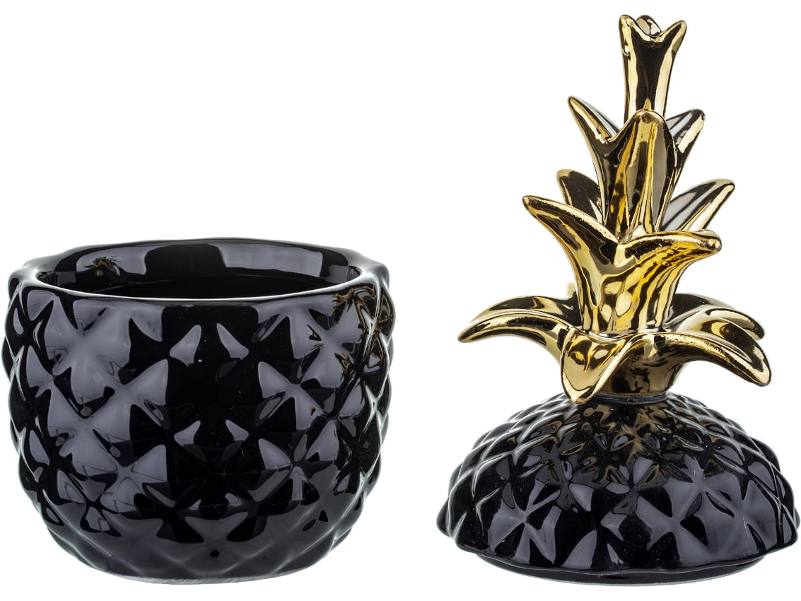 Figurka / pojemnik ANANAS - wykonany z ceramiki w kolorze czarnym ze złotym zdobieniem. Pojemnik składa się korpusu oraz pokrywki.