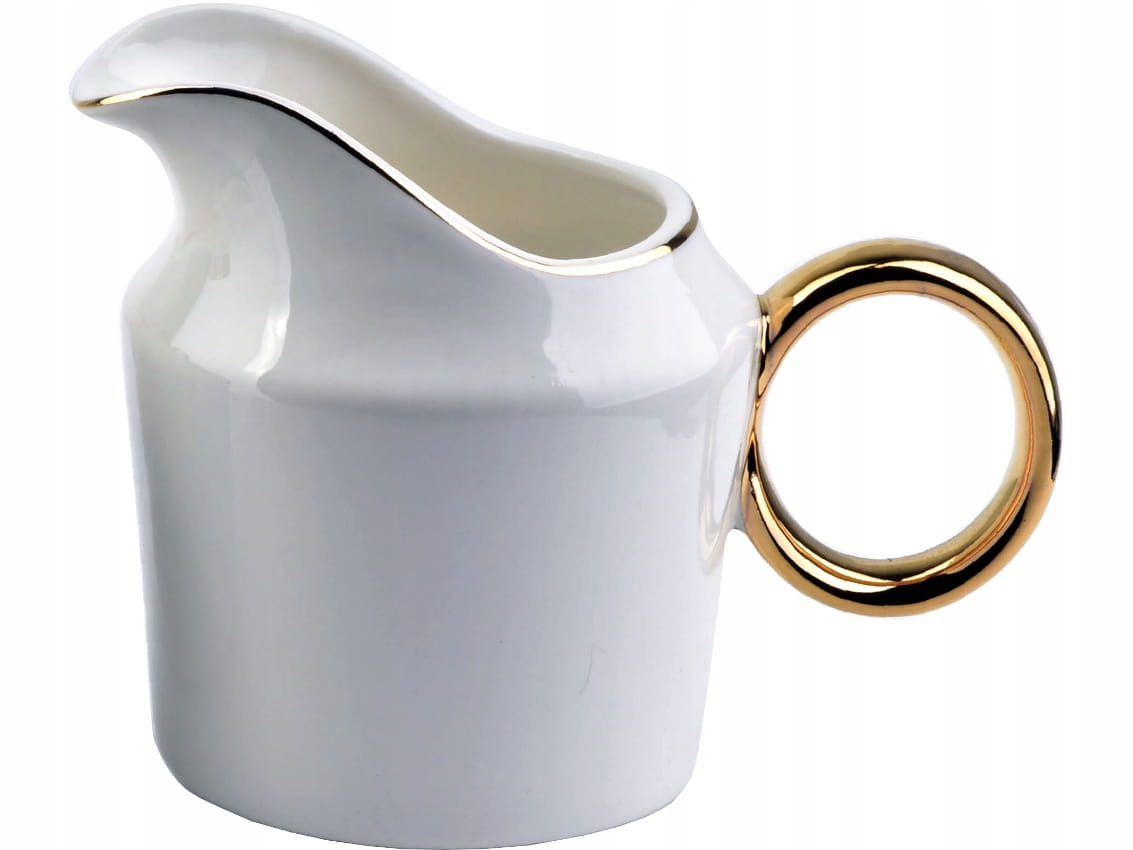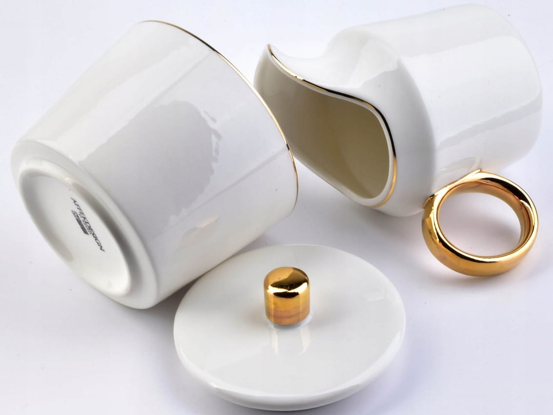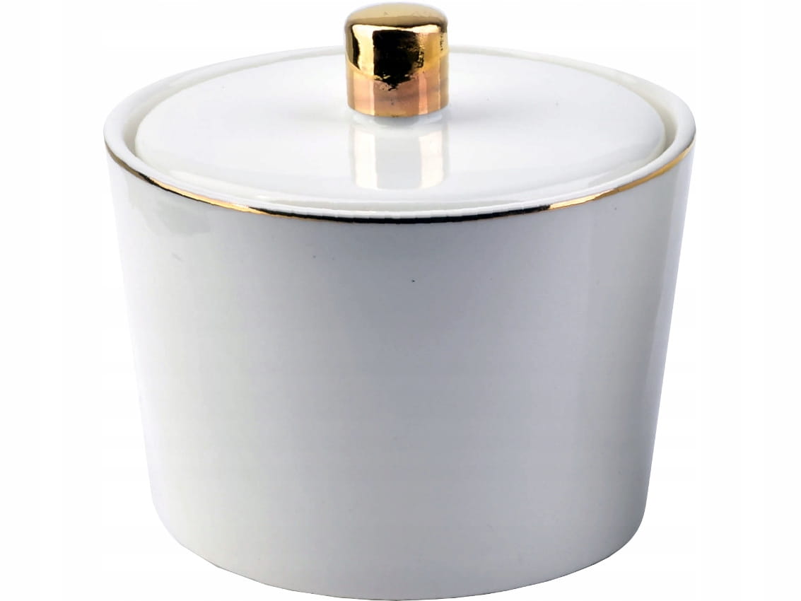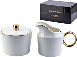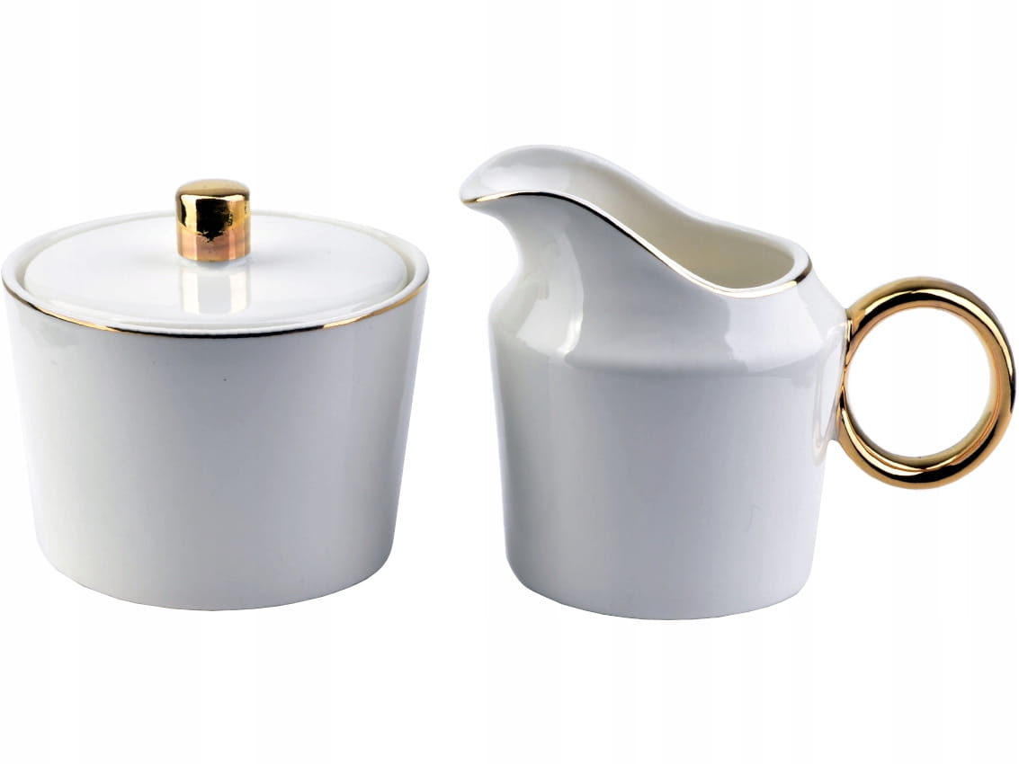 Zestaw wykonany jest z wysokiej jakości porcelany w kolorze białym, a oba elementy ozdobione są złotymi akcentami.