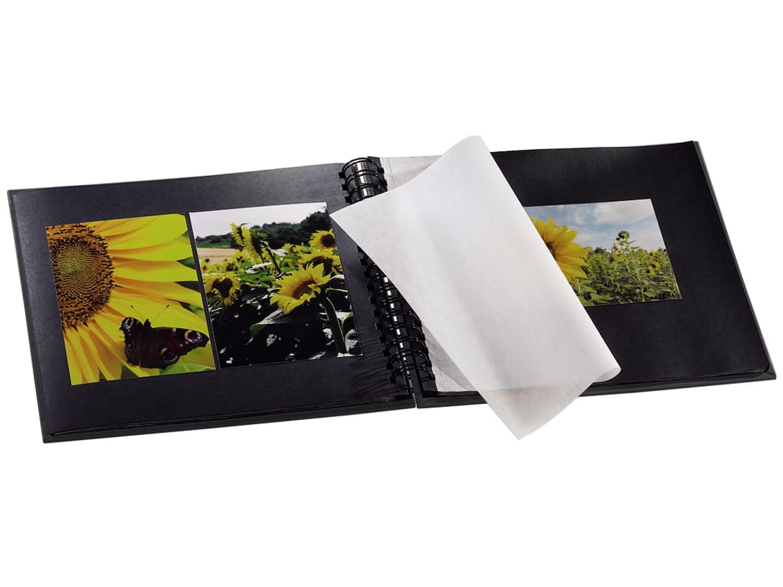 Album spiralny z czarnymi stronami z kartonu oraz pergaminowymi przekładkami.