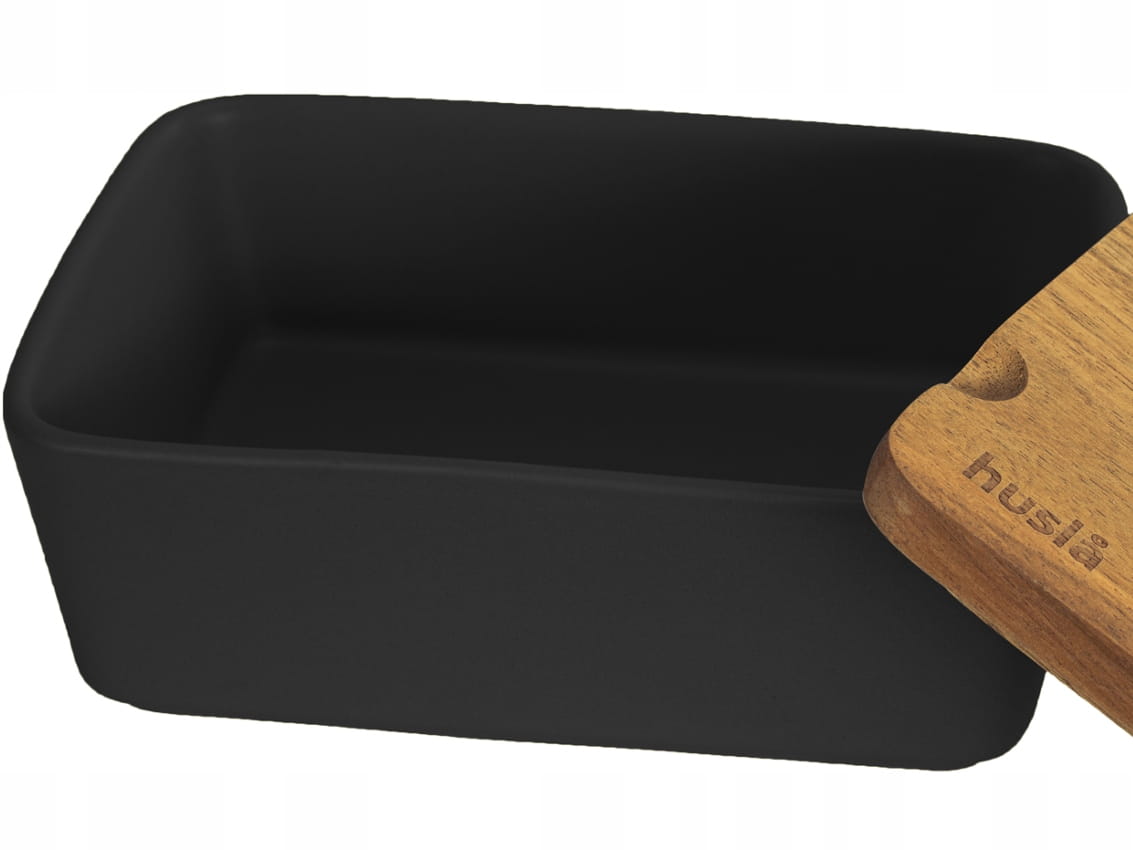 Ceramiczna maselniczka w kolorze czarnym, z pokrywą wykonaną z drewna akacjowego. W zestawie profilowany nożyk do smarowania, wykonany ze stali nierdzewnej, z rączką z drewna akacjowego.