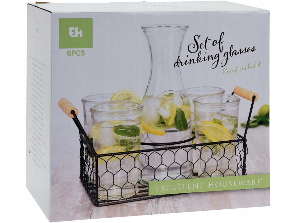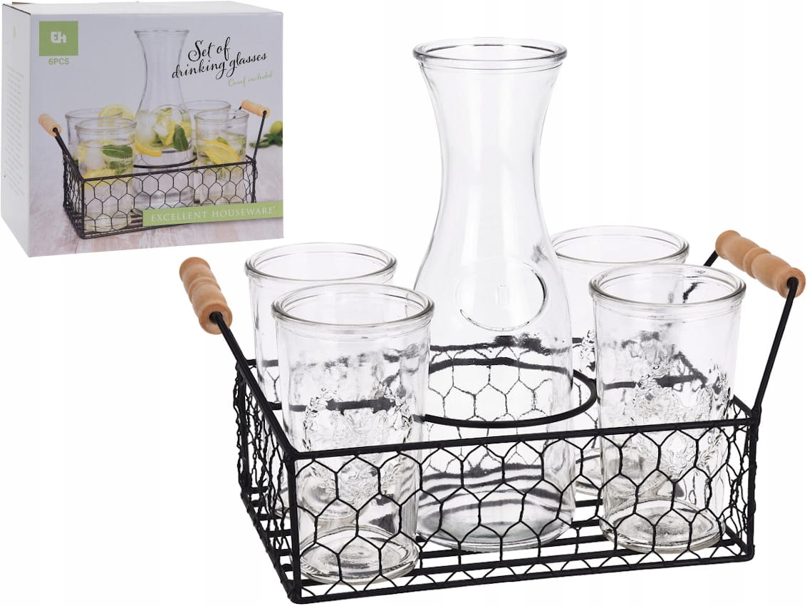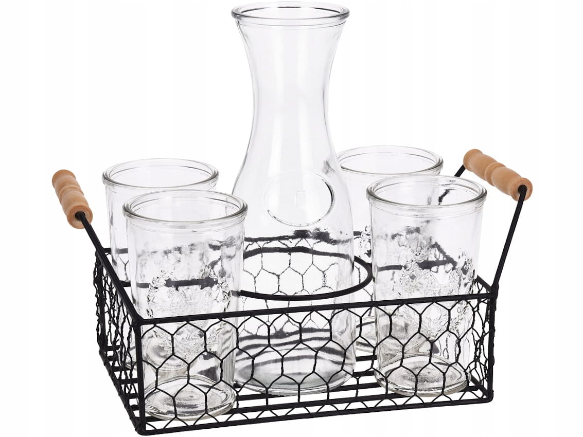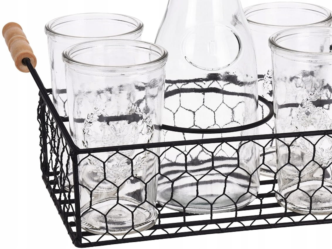 - Dzbanek i szklanki - z grubego tłoczonego szkła - umieszczone są w metalowym, czarnym koszyku z drewnianymi rączkami
