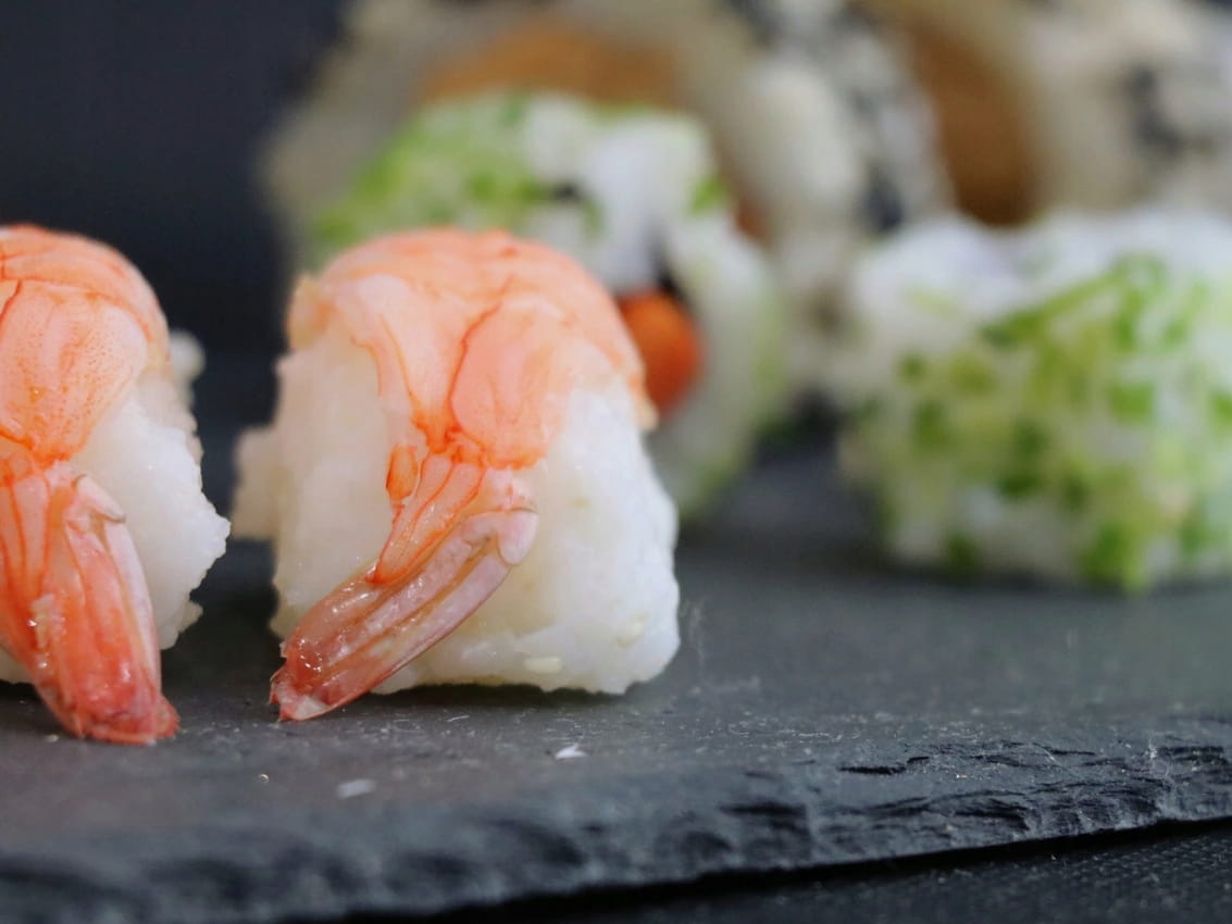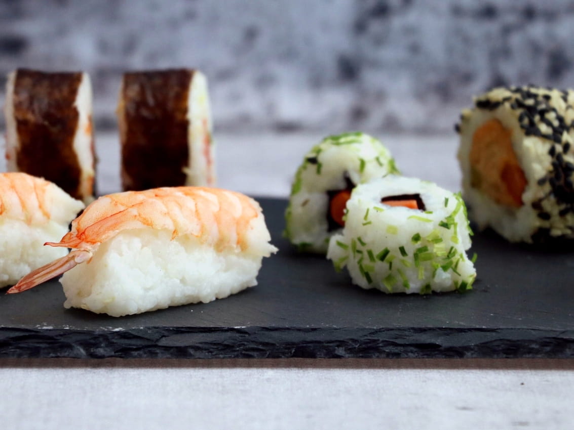Kamienna podstawka do serwowania dań, na profilowanej desce z drewna bambusowego.