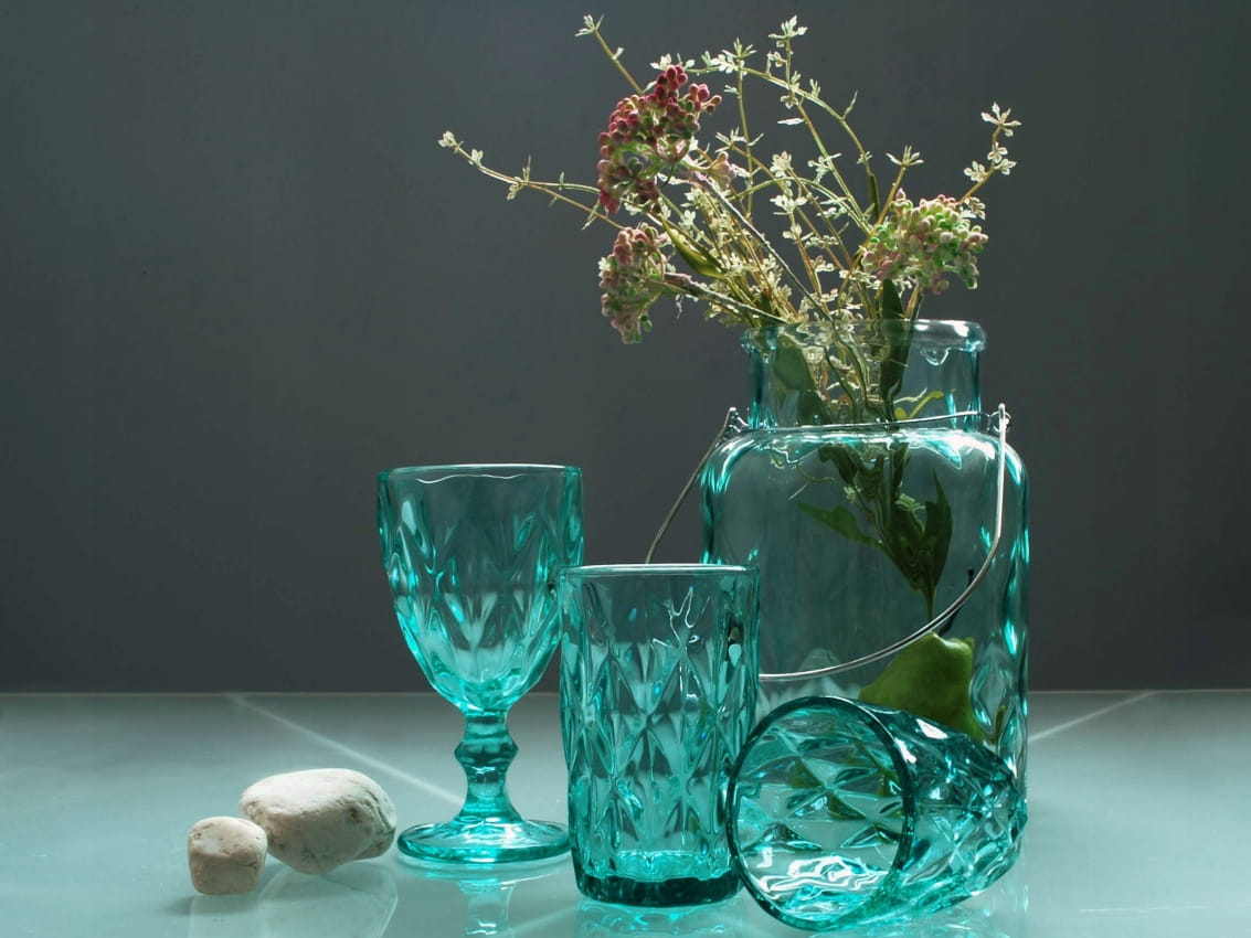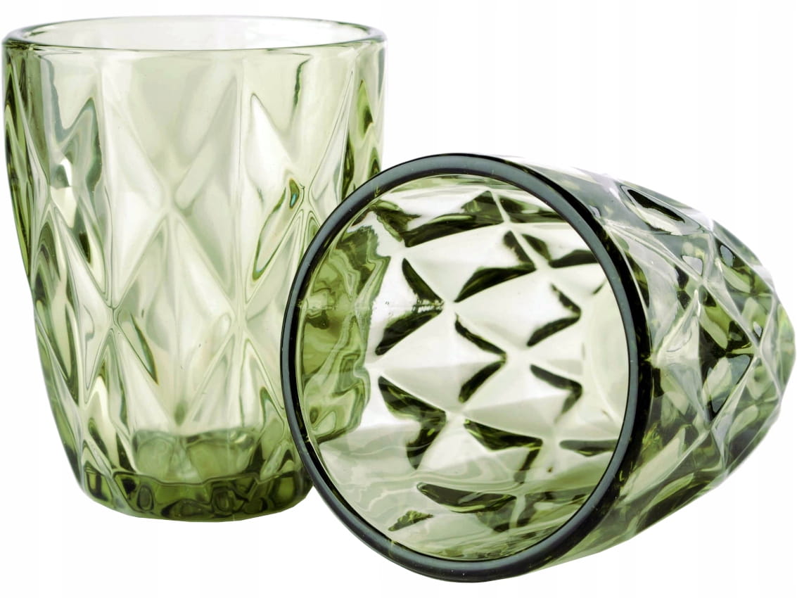- Szklanki z grubego tłoczonego szkła, barwionego na zielono