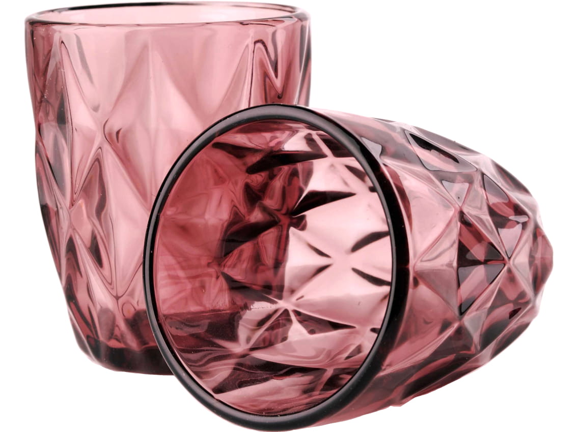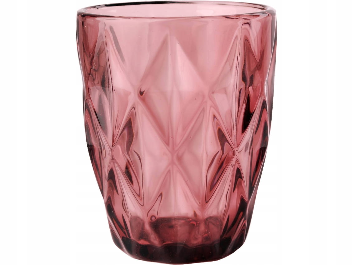 - Szklanki z grubego tłoczonego szkła, barwionego na różowo