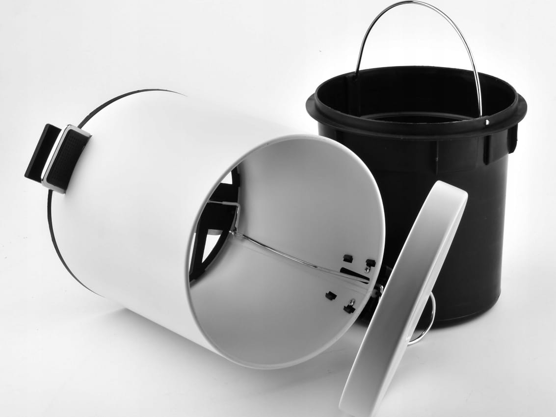 - Kosz na odpady wykonany z metalu malowanego proszkowo na biało, z metalową pokrywą