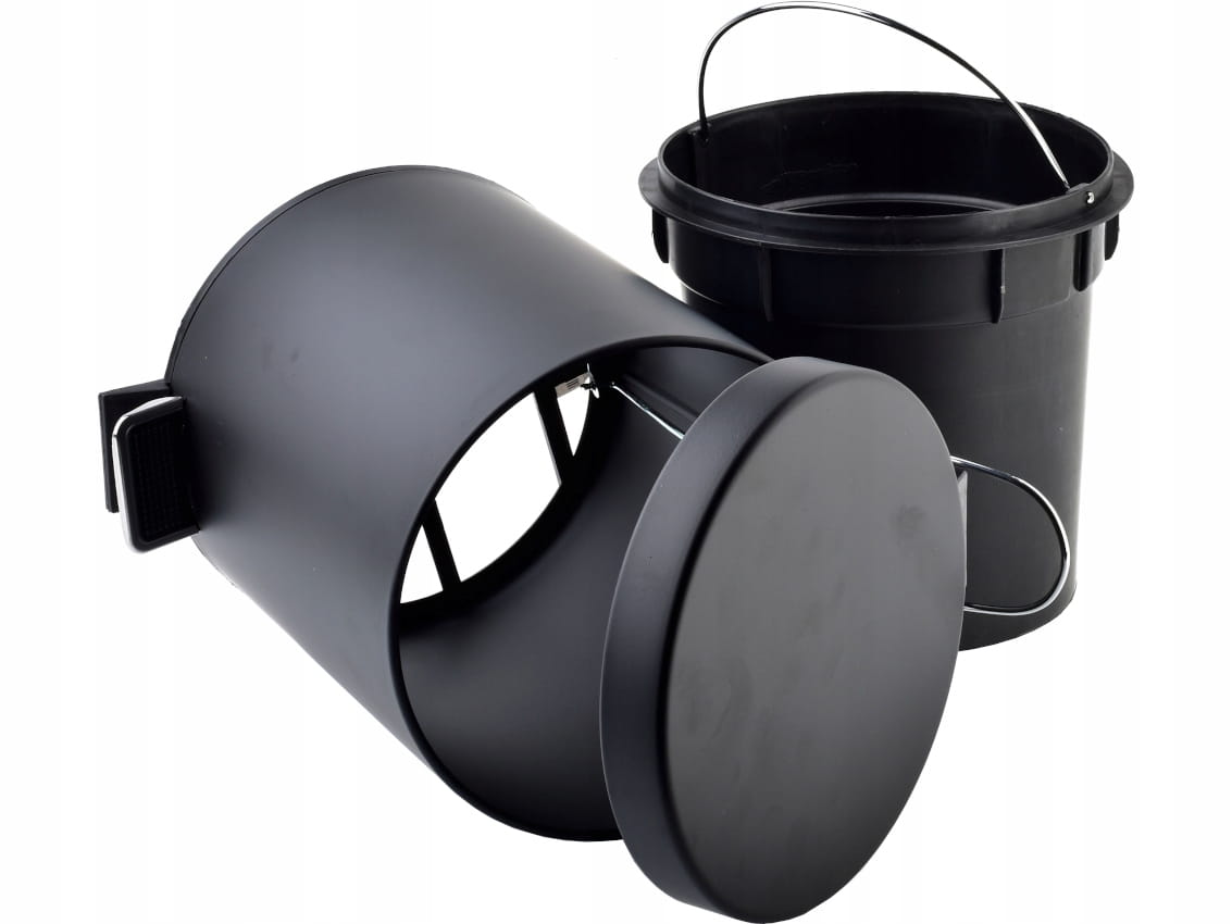 - Kosz na odpady wykonany z metalu malowanego proszkowo na czarno, z metalową pokrywą