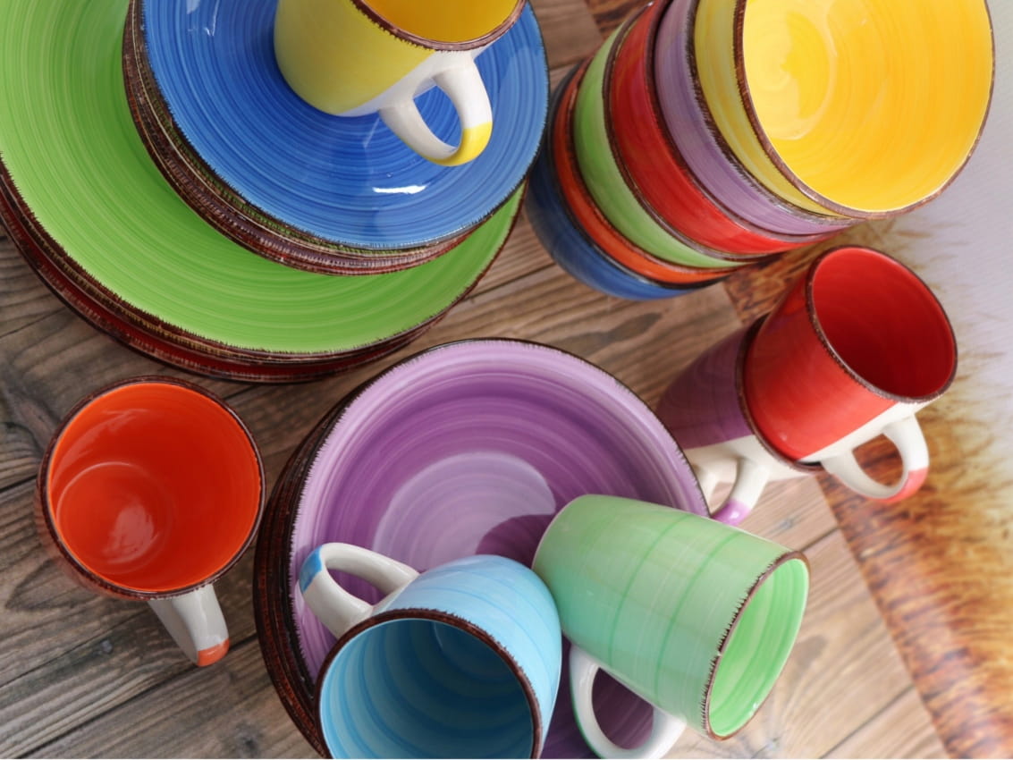 Przepiękne, kolorowe, ceramiczne kubki w odcieniach kolorów tęczy.