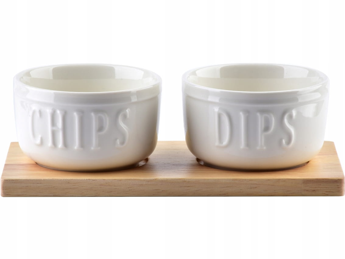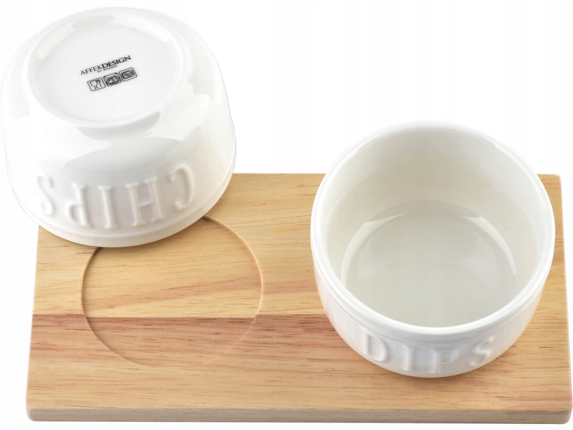 Zestaw 2 porcelanowych miseczek, na drewnianej tacy, do serwowania oliwek, orzeszków, przekąsek, sosów. Doskonałe również do słodkich mini deserów.