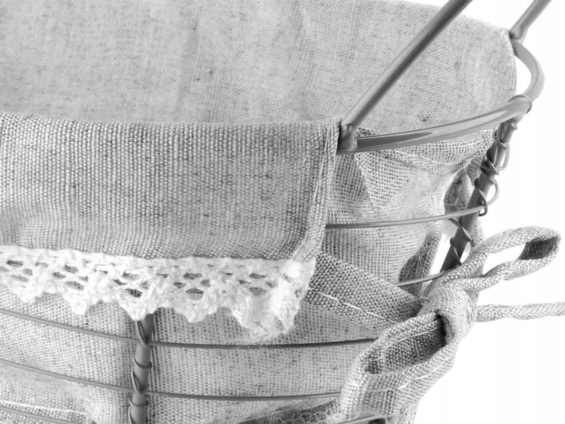 - Szary metalowy koszyk, wyściełany szarym materiałem, zdobionym białą koronką