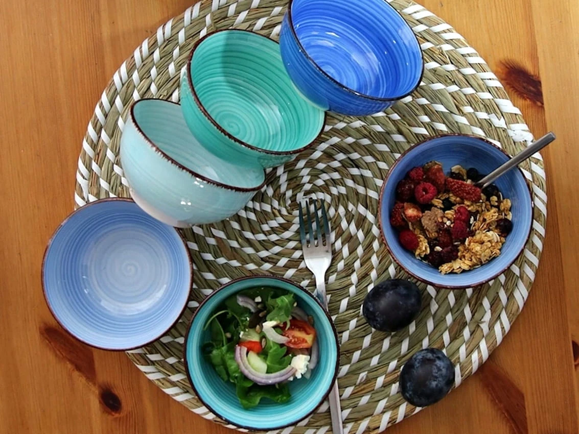 Przepiękne, kolorowe, ceramiczne miseczki w różnych odcieniach niebieskiego.