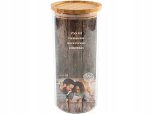 Szklany pojemnik, do przechowywania żywności, z pokrywką z drewna bambusowego (może zostać wykorzystany do przechowywania sypkiej żywności - np. mąki, cukru, soli, kawy, herbaty, makaronu, ryżu itp).