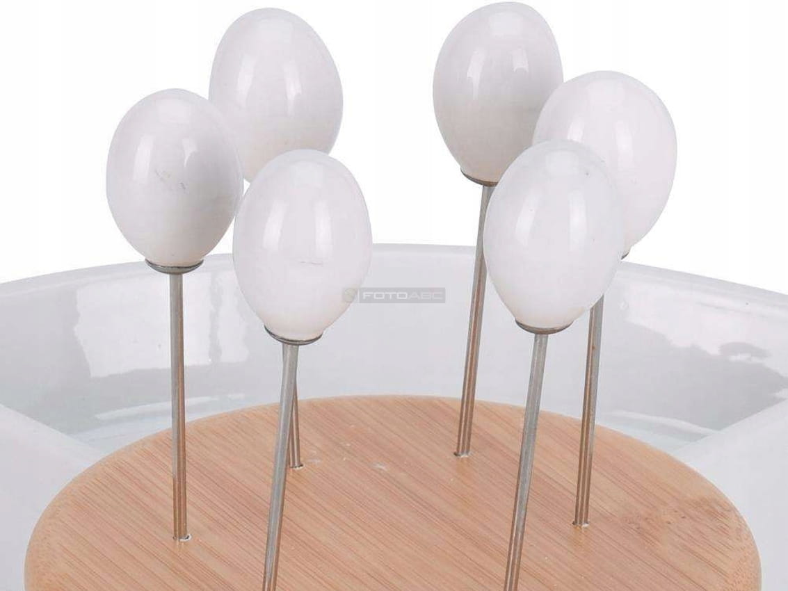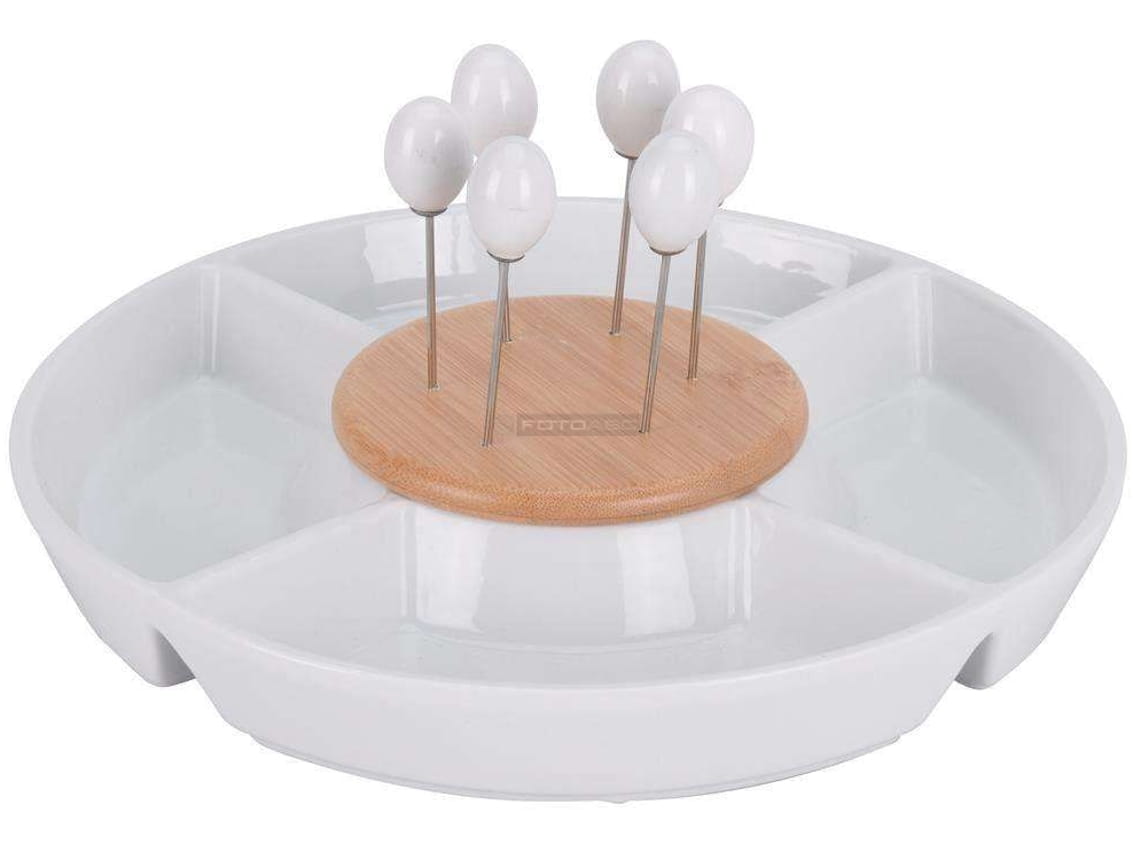 Porcelanowy talerz do serwowania przekąsek i przystawek, wraz ze stalowymi wykałaczkami do ich nabierania.