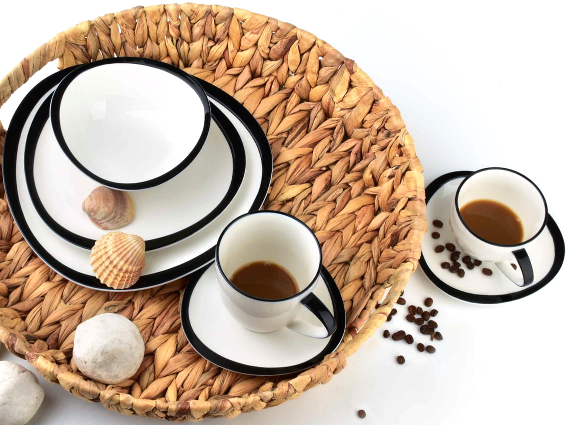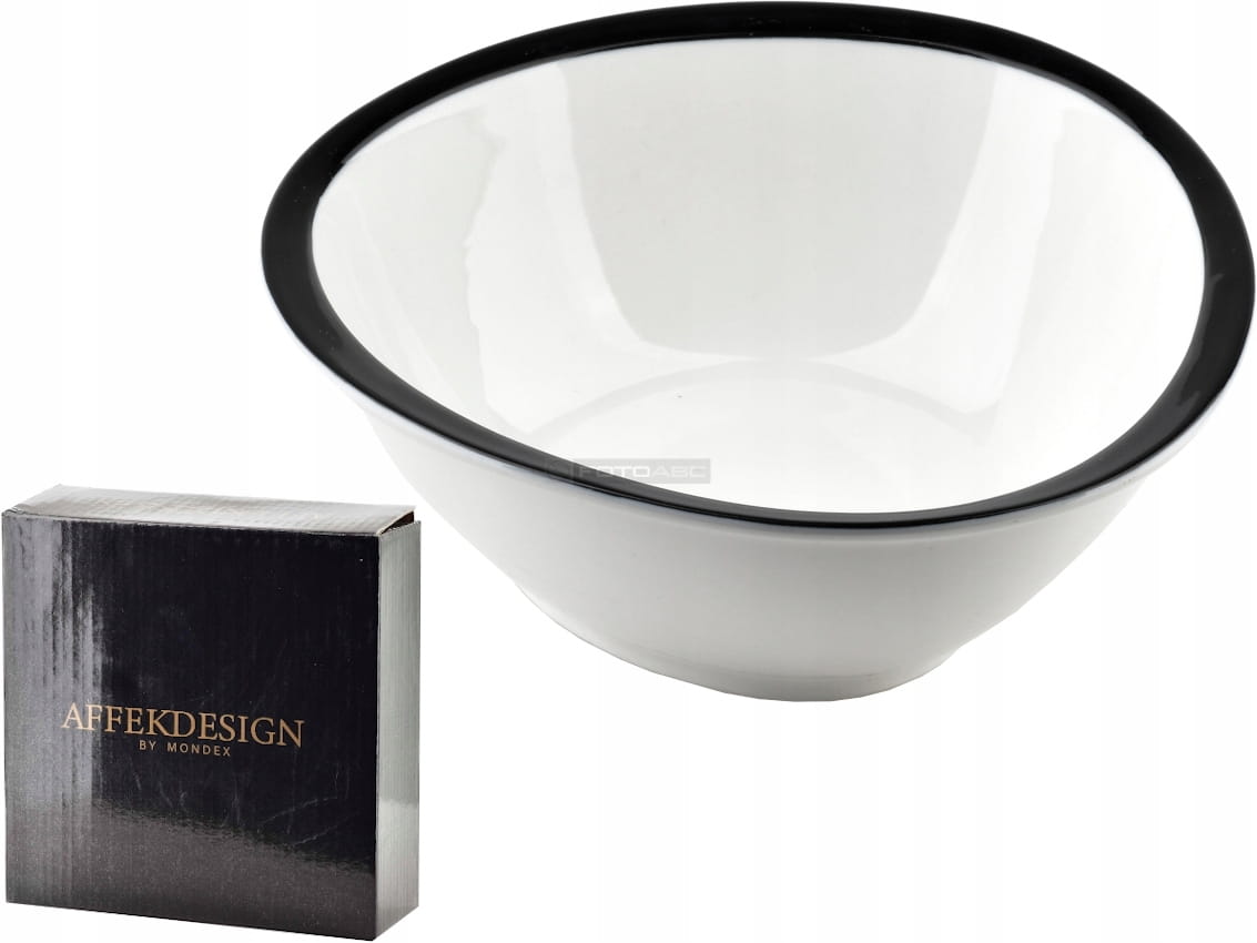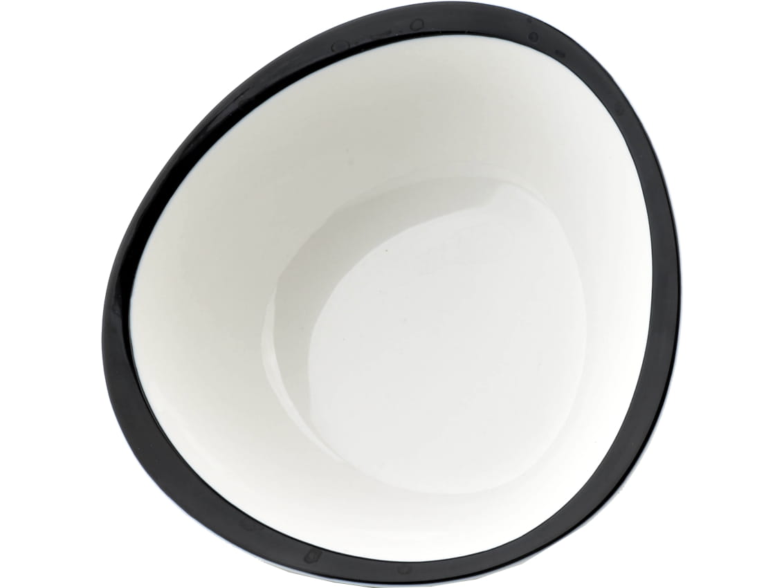 Wykonany jest z wysokiej jakości porcelany w kolorze białym, z czarnym zdobieniem.