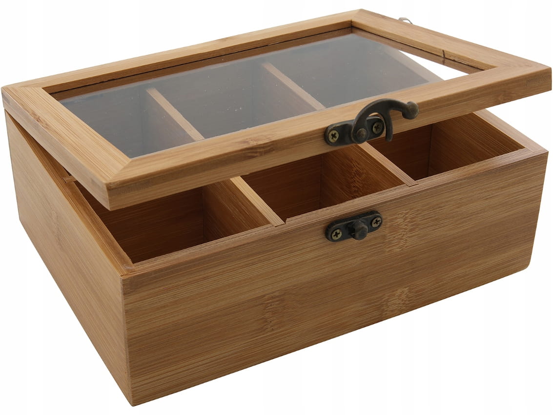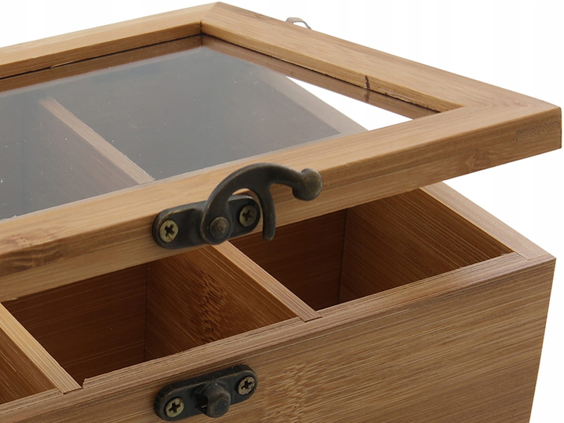 - Brązowa, bambusowa skrzyneczka na herbatę.