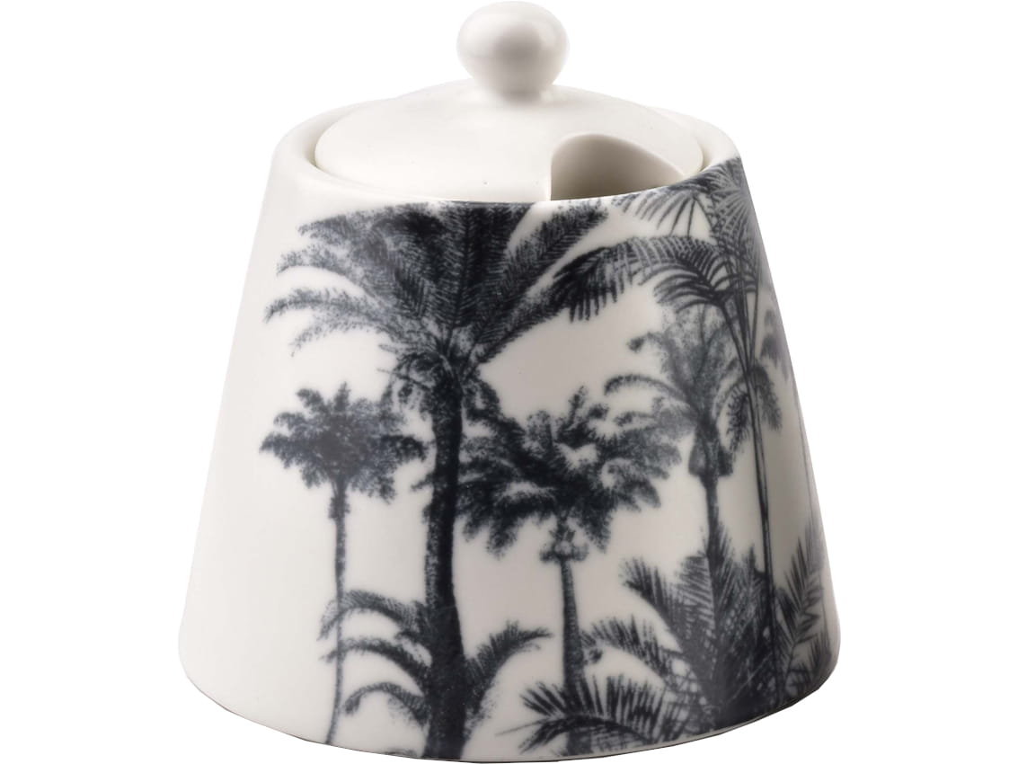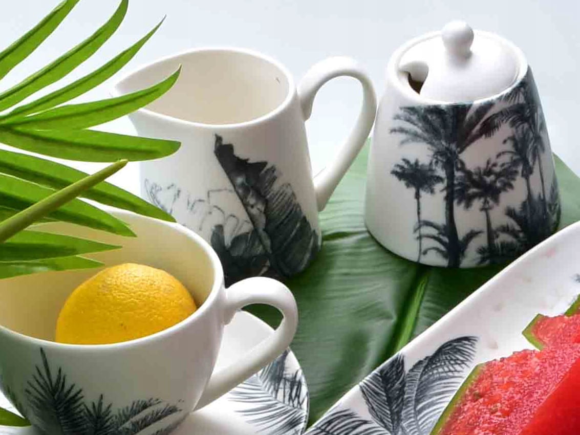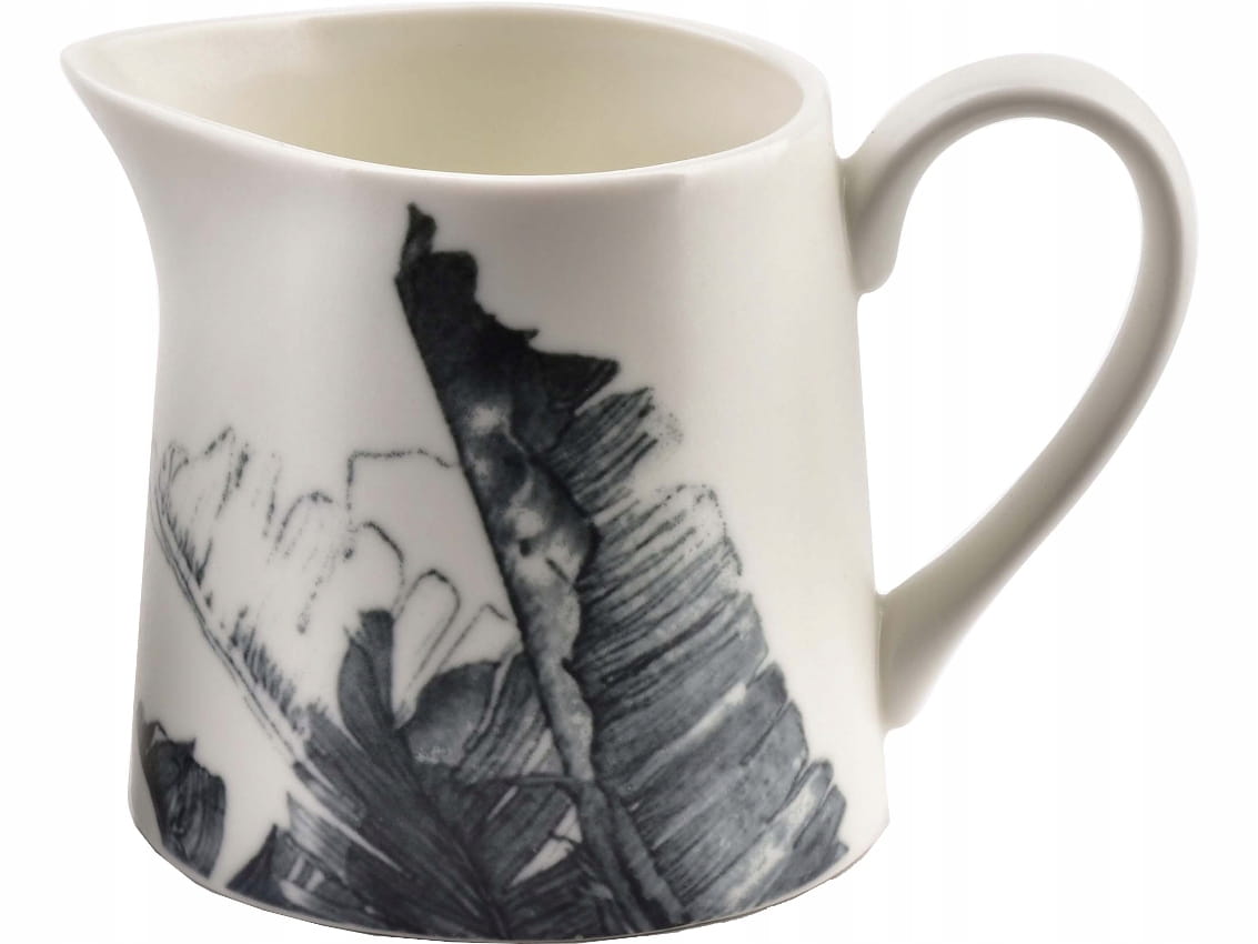 Zestaw wykonany jest z wysokiej jakości porcelany w kolorze białym, a oba elementy zestawu ozdobione są "tropikalnym" wzorem w kolorze ciemno szarym. Całość posiada matowe szkliwienie.