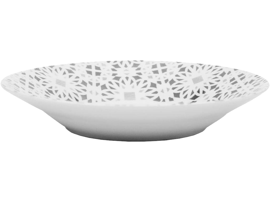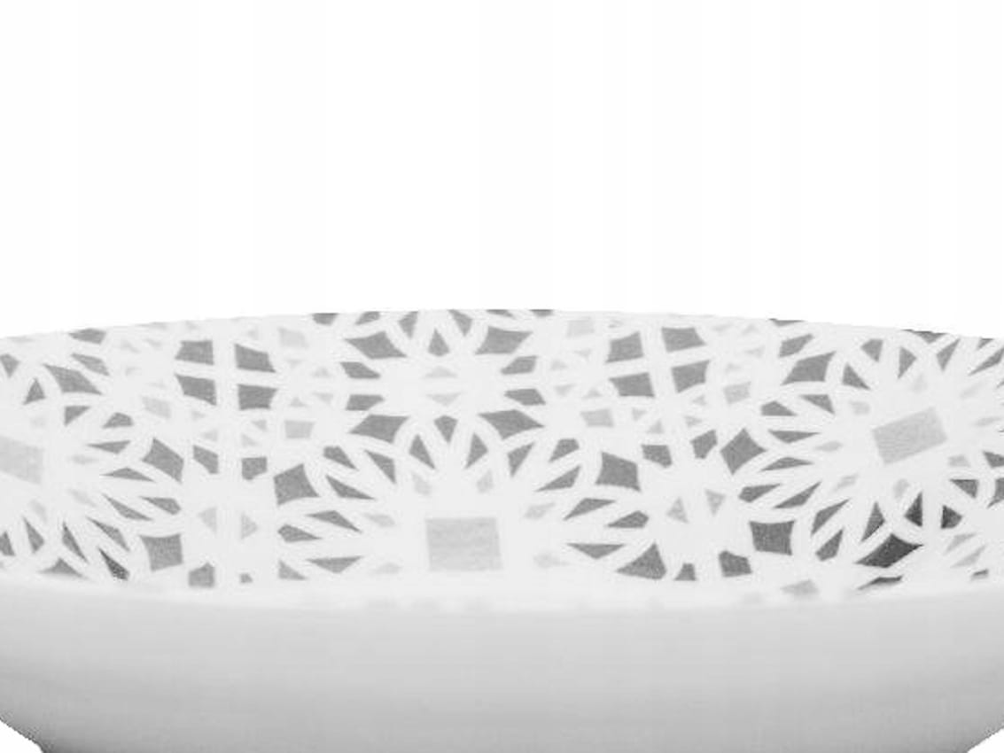 Przepiękne, białe, porcelanowe talerze do zupy z oryginalnym szarym, geometrycznym, marokańskim wzorem.