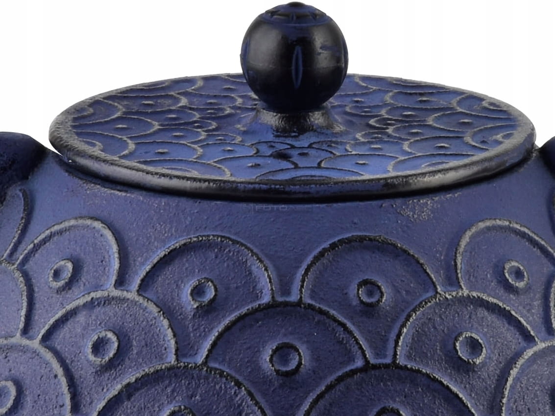 - Wykonany z wysokiej jakości żeliwa, z wytłaczanymi czarnymi dekoracyjnymi wzorami w kształcie rybiej łuski na granatowym tle.