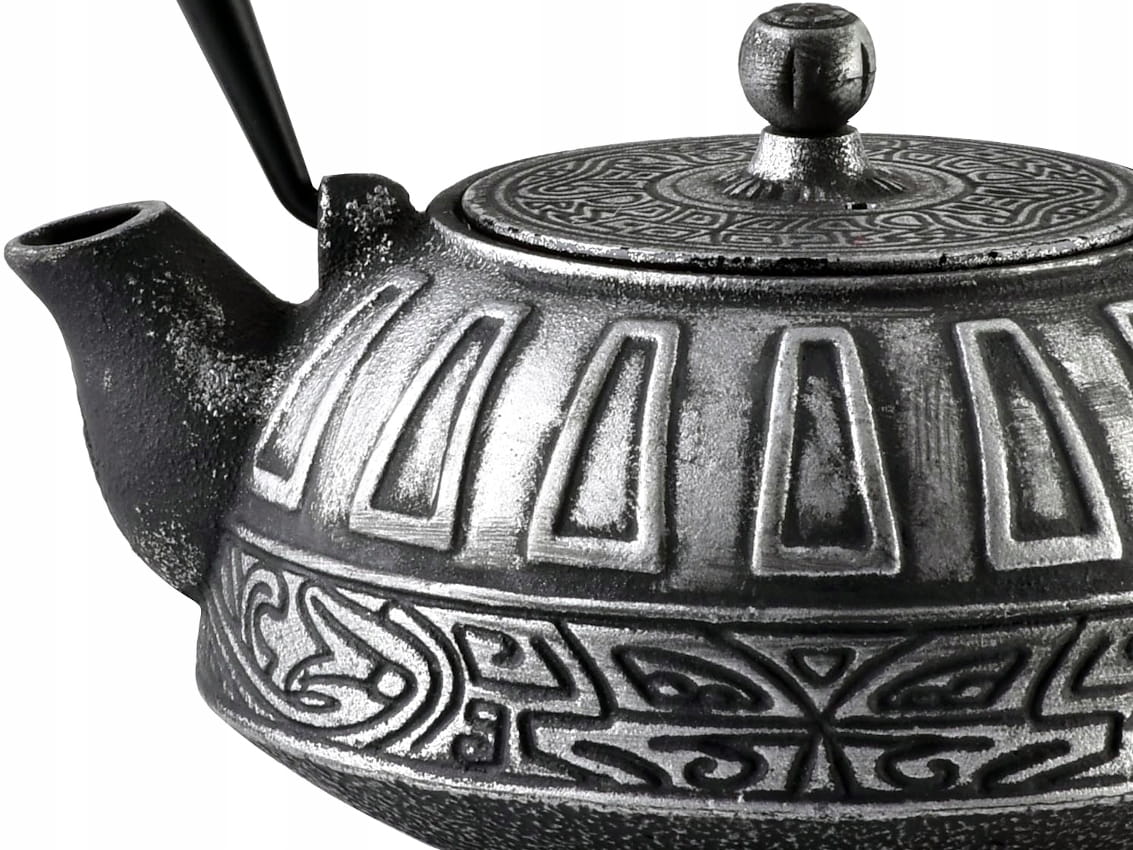 - Wykonany z wysokiej jakości żeliwa, z wytłaczanymi srebrnymi dekoracyjnymi wzorami na czarnym tle.