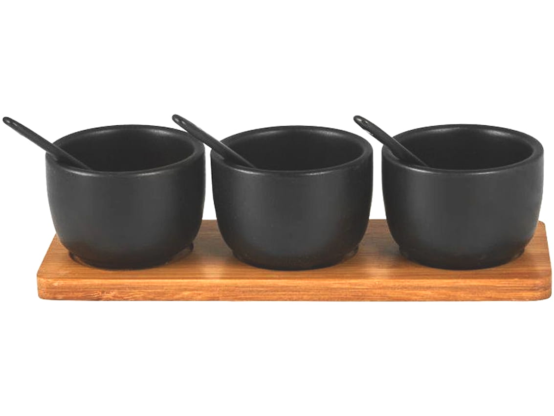 - Zestaw 3 kamionkowych miseczek, na podłużnej bambusowej podstawie, która ułatwi ich serwowanie